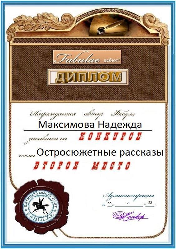 Автор: Максимова НадеждаПриняла участие в конкурсе на сайте Фабула Дебют. По началу было 16 участников и по 3 рассказа от каждого. Система такая, что набравший наименьшее количество баллов от читателей выбывает.