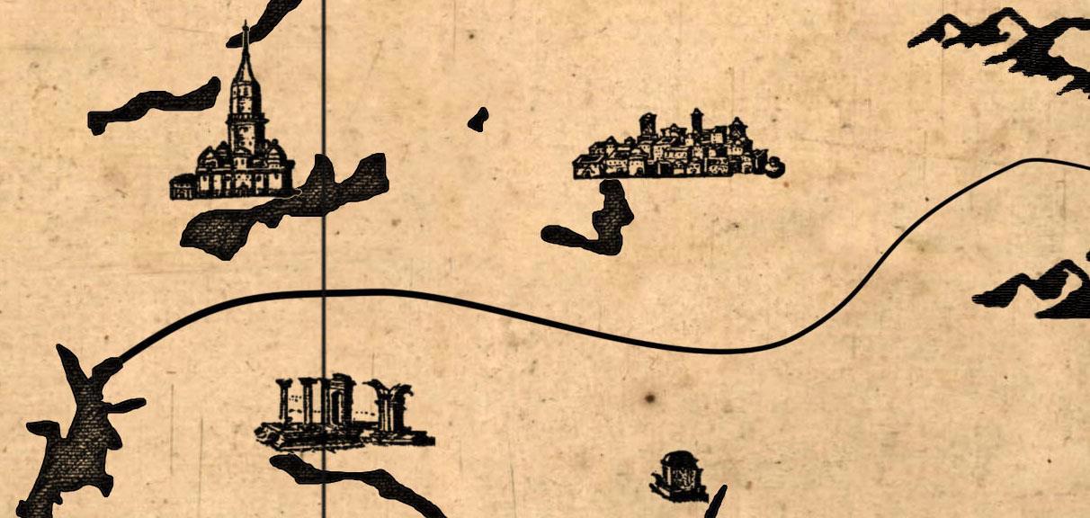 Набросав реки, я занялся городами. Так как благодаря горам карта получилась монохромной, решение сделать города такими же было достаточно очевидным. Сначала я вспомнил о загрузочных экранах кампании Warcraft 3 - но иконка средневекового замка не очень годилась для моей эпохи Нового времени, да и тырить оттуда не хотелось, а попытки нарисовать свои иконки благополучно провалились. Ну и в итоге я взял карту Александрии от 1575 года, повырезал оттуда домишки и после "ксерокопии" и коррекции получил города. Вот такие:
