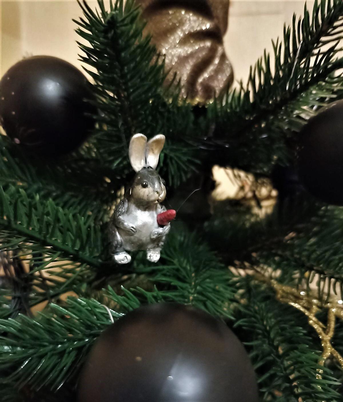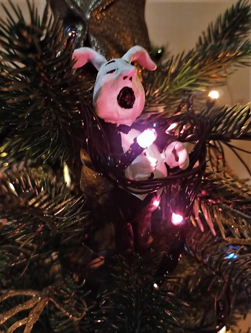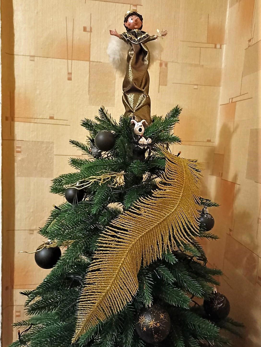 Всё предельно простенько, практически бихромно. На верхушке ангел, старая поделка. Лет 10 назад я проводила конкурс креативных ёлок на Эксмо Форуме, так этот ангел был призом. Выиграл его человек Наташа из Рязани, которая испекла сотню имбирных пряников разной формы и декорировала ёлку ими, но на почте ангела не взяли, сказали «таке не мона». Тогда я послала Наташе 7 маленьких розовых наркоманских слонов с дурными глазками, а ангел остался дома.