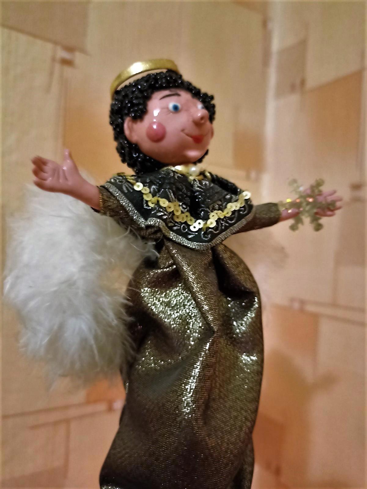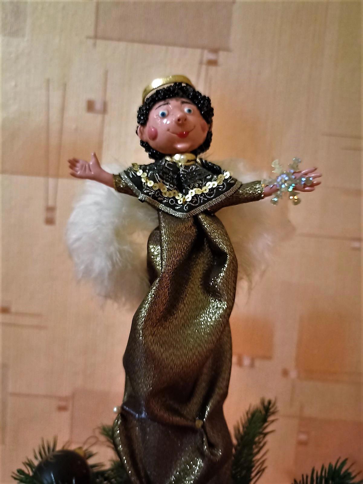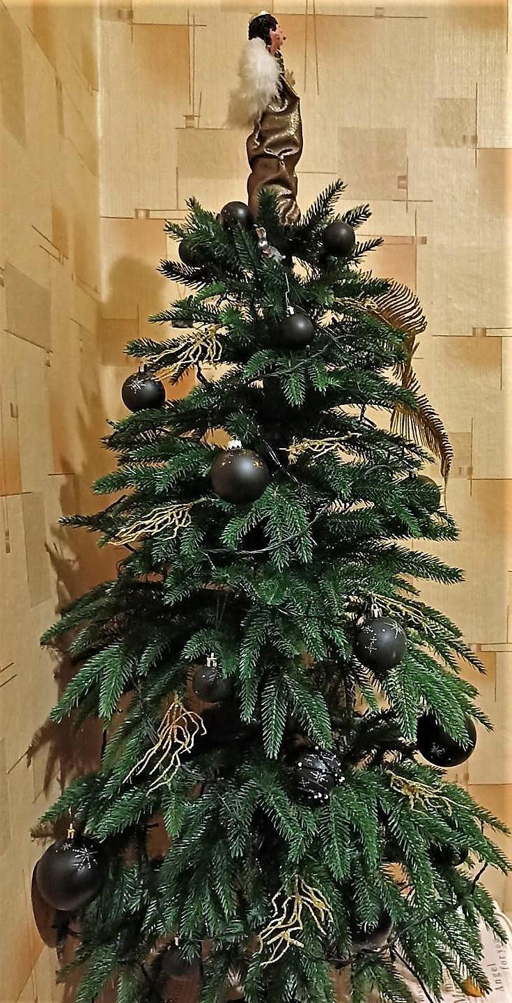 Всё предельно простенько, практически бихромно. На верхушке ангел, старая поделка. Лет 10 назад я проводила конкурс креативных ёлок на Эксмо Форуме, так этот ангел был призом. Выиграл его человек Наташа из Рязани, которая испекла сотню имбирных пряников разной формы и декорировала ёлку ими, но на почте ангела не взяли, сказали «таке не мона». Тогда я послала Наташе 7 маленьких розовых наркоманских слонов с дурными глазками, а ангел остался дома.