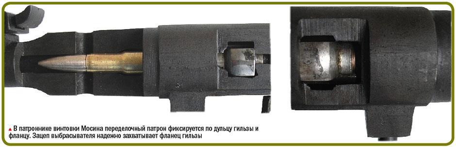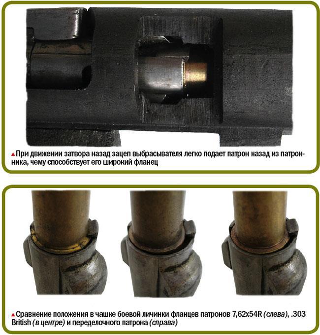...Из всех иностранных боеприпасов только .303 British был близок по габаритным характеристикам к русскому трехлинейному винтовочному патрону (7,62х54R): английский боеприпас имеет такой же диаметр пули и широкий массивный фланец, достаточный для фиксации боеприпаса в патроннике трехлинейной винтовки. Но, в отличие от русского патрона, у британского боеприпаса более тонкий корпус и высоко расположенный скат гильзы. Благодаря внешнему сходству неопытный солдат вполне мог принять английский патрон за обычный трехлинейный и попытаться снарядить им свою винтовку. Случаи нештатного использования патронов .303 British с русским оружием кал. 7,62х54R имели место как во время Первой мировой и Гражданской войн, так и во время Великой Отечественной. При досылании в патронник трехлинейной винтовки английский патрон упирается скатом гильзы в скат патронника и не дает закрыть затвор. Приложив некоторое усилие, можно деформировать стенки гильзы и закрыть затвор. Однако такое «силовое» использование боеприпаса утомляет стрелка и может привести к повреждению гильзы, которое станет причиной ее разрыва при выстреле и прорыву пороховых газов через затвор. В условиях острого дефицита винтовочных боеприпасов в 1919 г. военное руководство Красной армии приняло компромиссное решение о переделке английских патронов для использования в отечественном оружии кал. 7,62х54R.