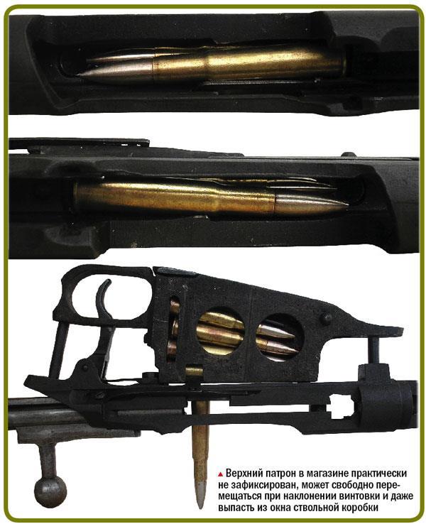 Проверка функционирования переделочных патронов в винтовке Мосина дала вполне предсказуемые результаты. Большинство найденных переделочных патронов были снаряжены в штатные английские обоймы Charger, .303-inch cartridges, Mark II. Применение обойм не совсем понятно: скорее всего, это было сделано только для удобства упаковки и транспортировки, т. к. ширина выступа в нижней части английской обоймы составляет 5,3 мм, что исключает ее использование для снаряжения трехлинейной винтовки с шириной паза под обойму порядка 4,6 мм. Снаряжение магазина русской винтовки по одному патрону производится достаточно легко. Переделочные патроны легко заходят под лопасть и далее, под отсекающий зуб отсечки-отражателя, и занимают свои места в коробке магазина. Фланец верхнего патрона находится перед фланцем нижнего патрона. Из-за того, что английские патроны имеют меньший диаметр корпуса гильзы, надежно зафиксированы в магазине только нижние 4 патрона, удерживаемые отсекающим зубом отсечки-отражателя. Верхний боеприпас свободно перемещается между плоскостями отсечки и отражателя и при наклонении винтовки свободно отклоняется вниз к стенке ствольной коробки, а при переворачивании винтовки с открытым затвором вообще может выпасть из верхнего окна ствольной коробки. Различия в диаметре и конусности корпуса гильзы переделочного и штатного трехлинейного патронов значительно сказываются на досылании в патронник. Линия досылания переделочного патрона несколько занижена, что приводит к утыканию вершинки пули в казенный срез ствола. При резком движении затвора переделочный патрон слегка подпрыгивает и достаточно легко входит в патронник винтовки. В патроннике винтовки Мосина боеприпас .303 British/7,62x54R фиксируется по дульцу гильзы и фланцу. Зацеп выбрасывателя надежно захватывает фланец гильзы. При этом положительно сказывается увеличение диаметра фланца при обжимке патрона .303 British. Если фланец штатного патрона 7,62х54R заполняет всю чашечку боевой личинки до венчика и не может быть смещен в сторону, то британский патрон с меньшим фланцем при смещении от центра зеркала затвора может не попасть под зацеп выбрасывателя. Слегка увеличенный фланец переделочного патрона даже при максимальном смещении к венчику боевой личинки все равно захватывается выбрасывателем. Экстракция патрона производится достаточно легко. При движении затвора назад фланец патрона захватывается выбрасывателем, и патрон движется назад из патронника до тех пор, пока не упирается в отражательный выступ отсечки-отражателя и отбрасывается вправо. Неизвестно, насколько легко производится экстракция гильзы переделочного патрона, обжатой пороховыми газами по патроннику при выстреле. Меньший диаметр корпуса гильзы часто приводит к асимметричному расположению патрона в патроннике винтовки Мосина, что видно по несимметричному раздутию стреляных гильз и наколу капсюля. Также неизвестно, как часто будут происходить разрывы гильз .303 British из-за повышенной степени деформации (раздутия) в патроннике кал. 7,62х54R.