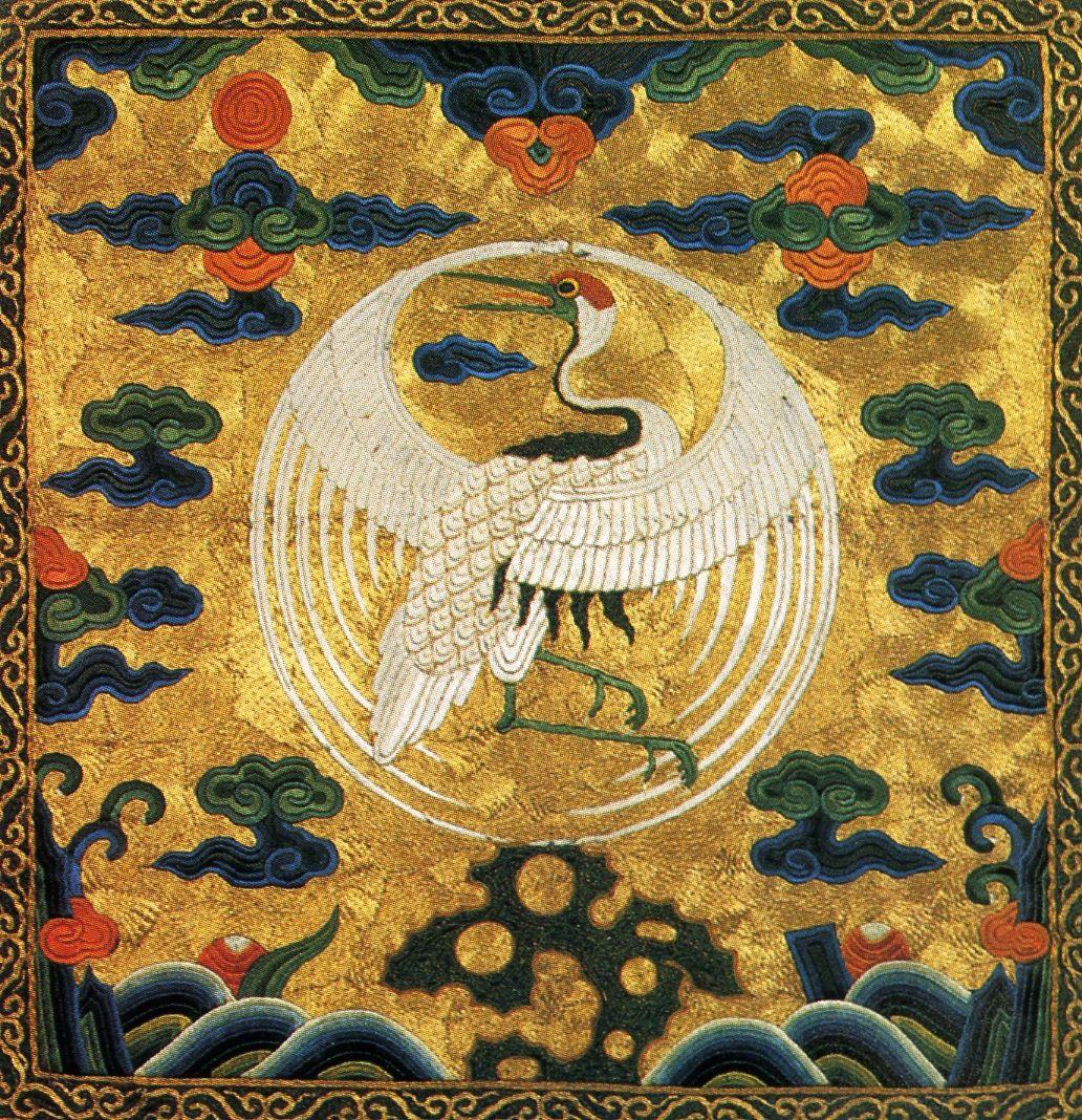 1 ранг. 仙鹤 "сян хэ" - божественный журавль, журавль бессмертных. Прототип - маньчжурский (японский журавль). Отличительный знак - красная шапочка на голове. Надо сказать, что красный хохолок может также присутствовать у фазана, но у него он в виде именно хохолка, а у журавля обычно головка круглая, а хвост, в отличие от фазана, короткий.