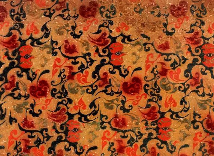 Далее вы видите фрагмент шелковой ткани, украшенной вышивкой, называемой长寿绣 /chan shou xiu/ "Долгая жизнь" (или "Долгой жизни" - как пожелание). Это традиционный орнамент из захоронений - пожелание счастливых и долгих лет в загробном царстве. Плавные изгибы малиновых, оливково-зеленых, темно-зеленых, синих и других нитей создают очертания стилизованных облаков, ветвей, листьев и профили фантастических животных, возможно, драконов. Дракон может указать путь к бессмертию.