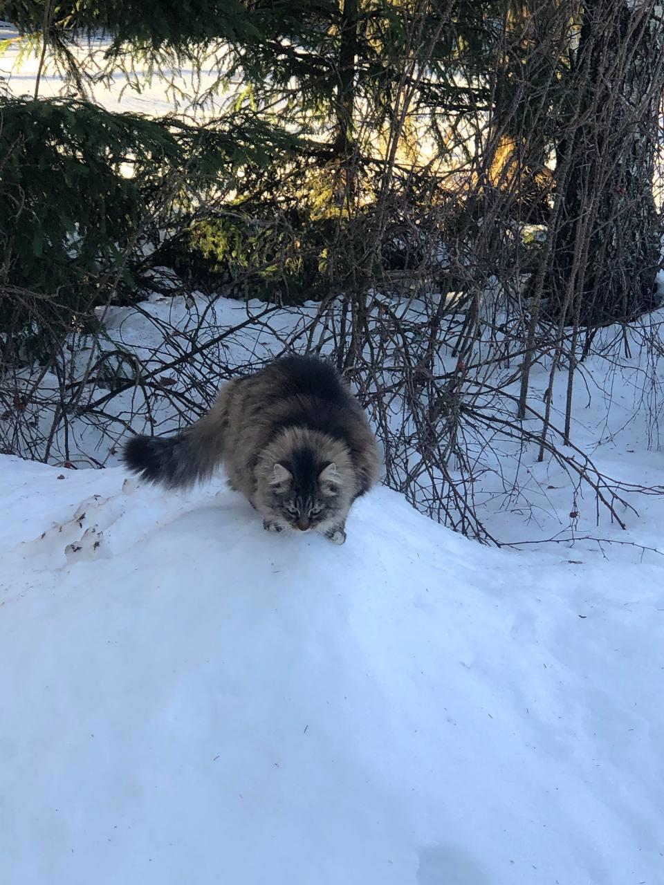 Сегодня Пуша все-таки решилась обследовать эти ужасы. Пять минут продержался героический кот, даже залез на снежный холмик и с отвращением его понюхал, после чего галопом поскакал в дом и еще долго старательно вылизывал перед печью замерзшие нежные пяточки.