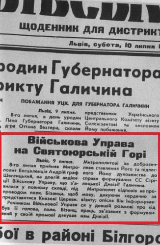 Газета «Львовские вести» от 10 июля 1943 года. Название новости: «Военное управление на Святоюрской горе». В новости сообщается, что фашистский полковник поблагодарил митрополита Андрея за создание его духовенством Дивизии СС Галичина).