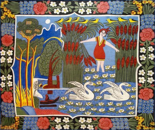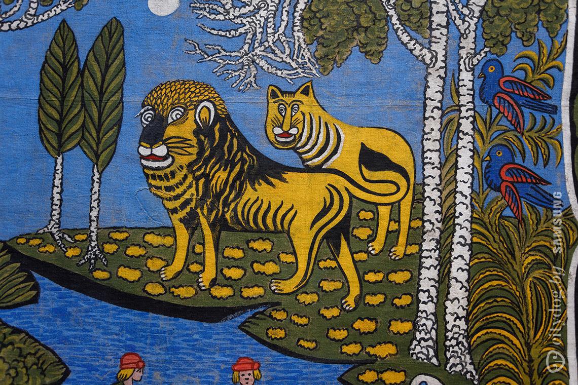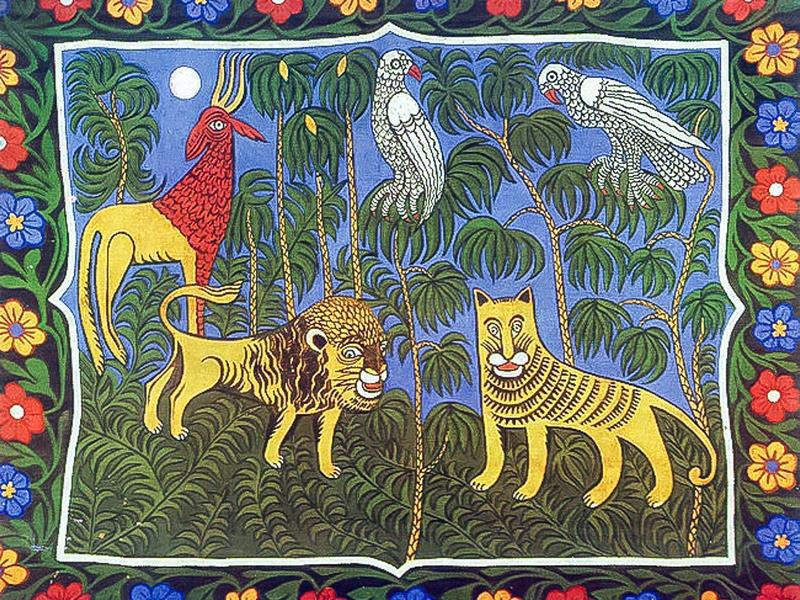 Одним из любимых сюжетов художницы-примитивистки был Райский сад. Невиданные цветы рамой обрамляли полотно, а внутри, как поется в песне — «гуляли животные невиданной красы». Улыбающиеся львы, трехрогие олени и сказочные птицы на фоне экзотических деревьев или водоемов. Так представлял простой народ райскую идиллию, так изображал ее в сказках и вышивках, таким писала его Алена. Полотна отвлекали от житейских трудностей — а их в крестьянском быту в любые времена хватало.