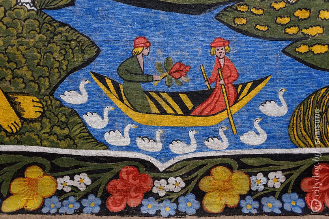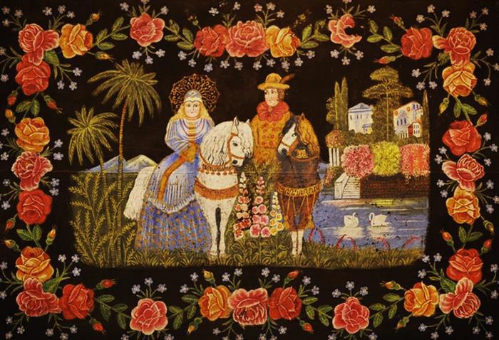 Поэтому не было деревенского дома, где не висели бы на видном месте расписные ковры. Чаще всего их дарили к свадьбе: украсить быт молодых, с пожеланием жить счастливо, как в Раю. Считалось, что они приносят счастье и незамужним молодым девушкам, еще дарили расписные ковры к новоселью и по случаю рождения ребенка. Они были в моде у крестьян с 20 годов прошлого века.