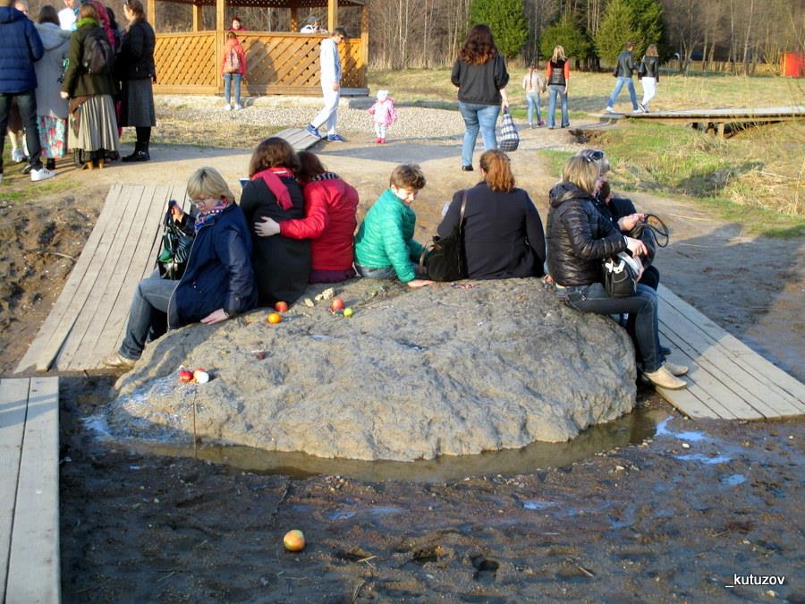 Казалось бы, всё. Но прошли годы, и Синь-камень выполз на берег. Не надо смеяться! Он выполз, по сю пору осталась колея, которую он проделал! Выполз, и отполз метров на сто от воды, и на некоторое время замер. Скорее всего, отдохнуть требовалось... Не зря он в последнее время медленно, но верно уходит в землю. Прячется. Пятьдесят лет назад возвышался над землей на полтора метра, сейчас осталось сантиметров тридцать.