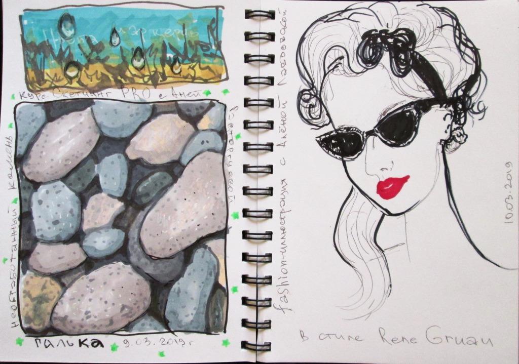 Предложение было явно больше моих возможностей, пришлось оганичить свои аппетиты и выбрать только самое для меня нужное: работа спиртовыми маркерами и рисование человека. Некоторые уроки я только просмотрела, но часть успела порисовать. Девушка - это урок с курс фэшин-иллюстрации с Аленой Лавдовской. Из её курса я выбрала несколько уроков. Этот мне показался одним из самых интересных - создание иллюстрации в стиле Rene Gruau. Фишка этого урока рисунок лица модели преимущественно чёрным цветом с единственным ярким пятном - ртом. Важна игра толщиной линии, где нос, волосы внутри силуэта прически рисуются тонкими линиями, абрис лица и шеи более толстой и изменчивой линией. Все линии должны быть уверенными и четкими. Получилось у меня не совсем чисто, но принцип я ухватила. Потом буду тренироваться дальше. Понравился этот стиль, где главное линия и пятно.