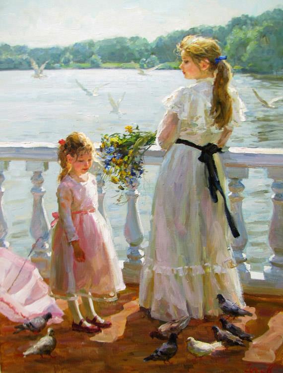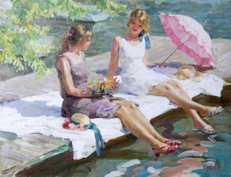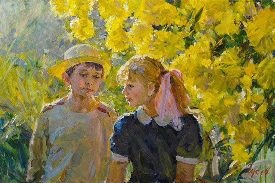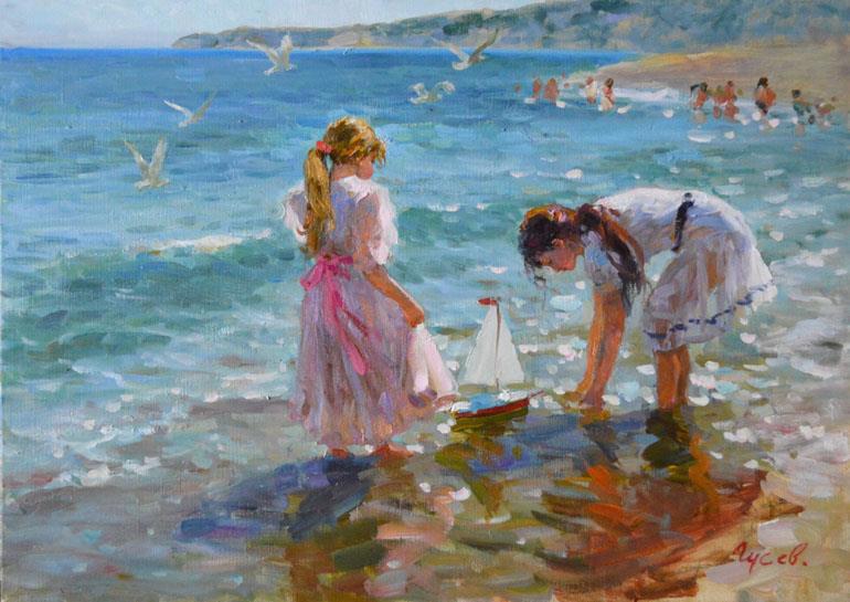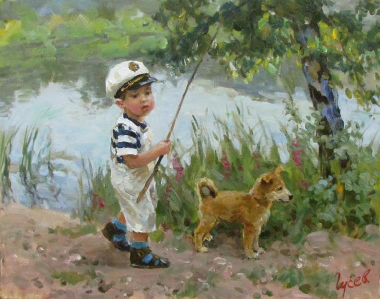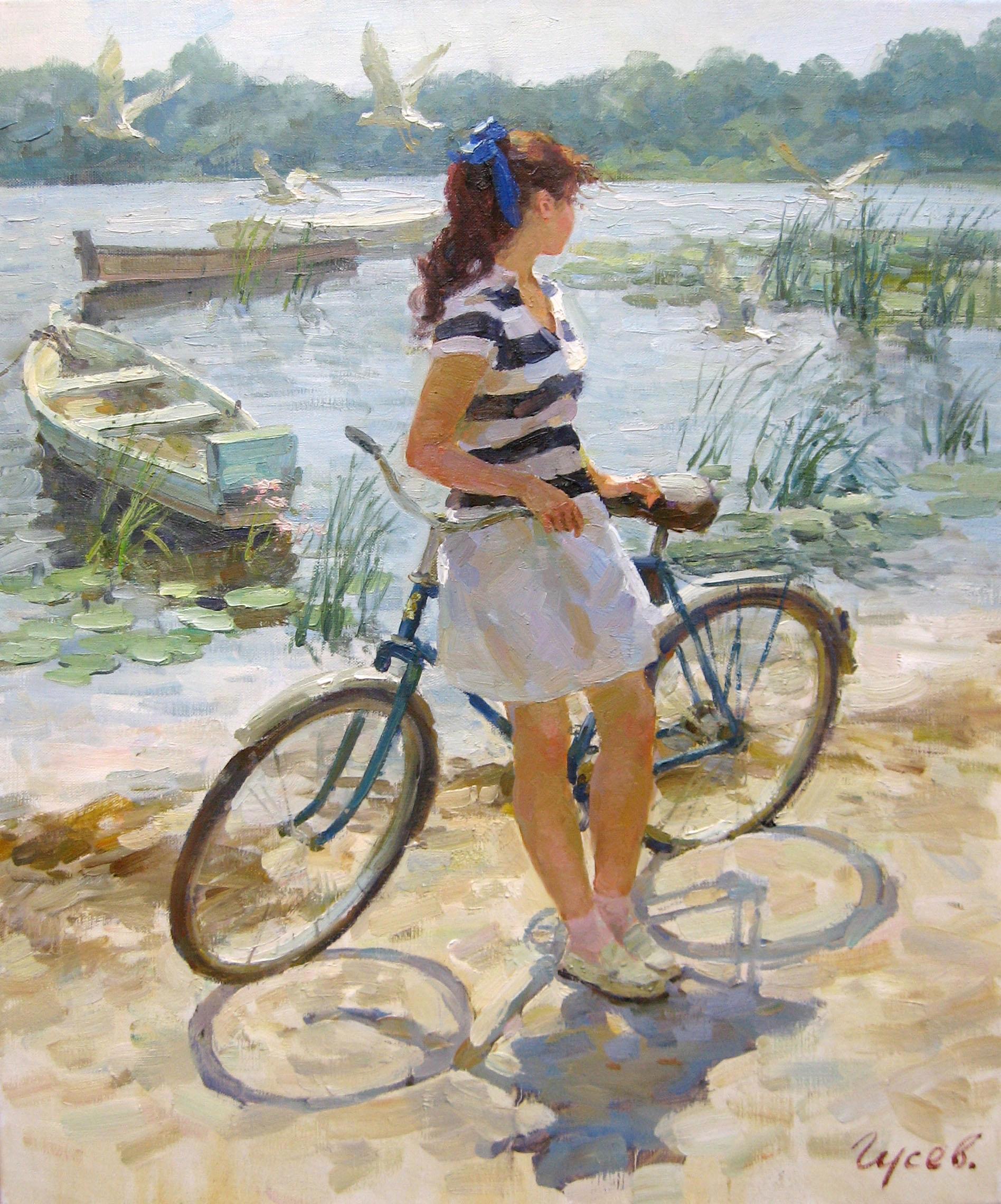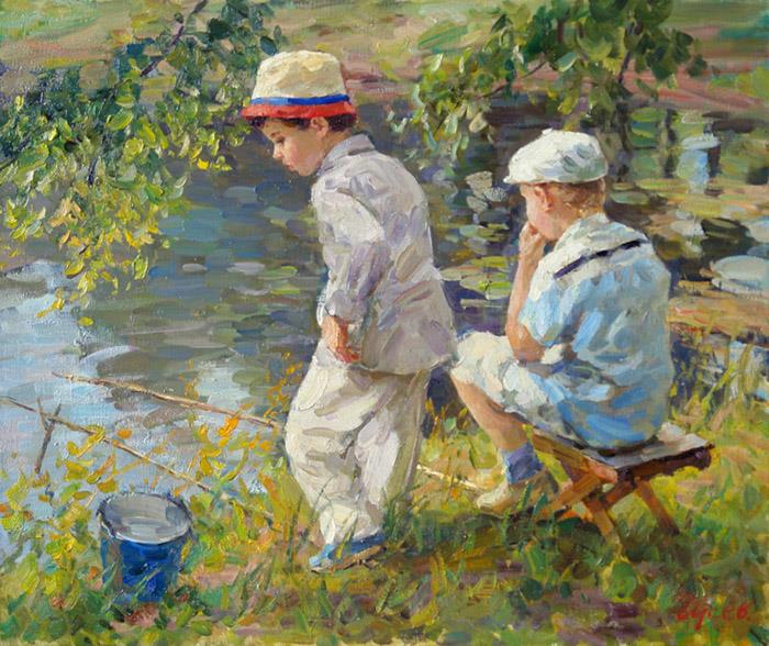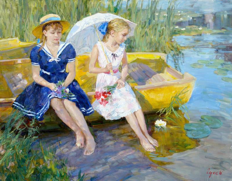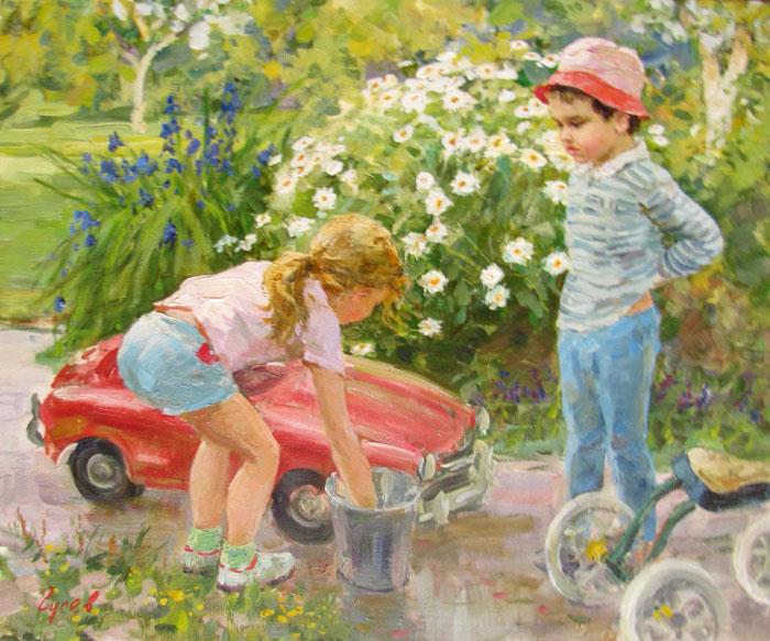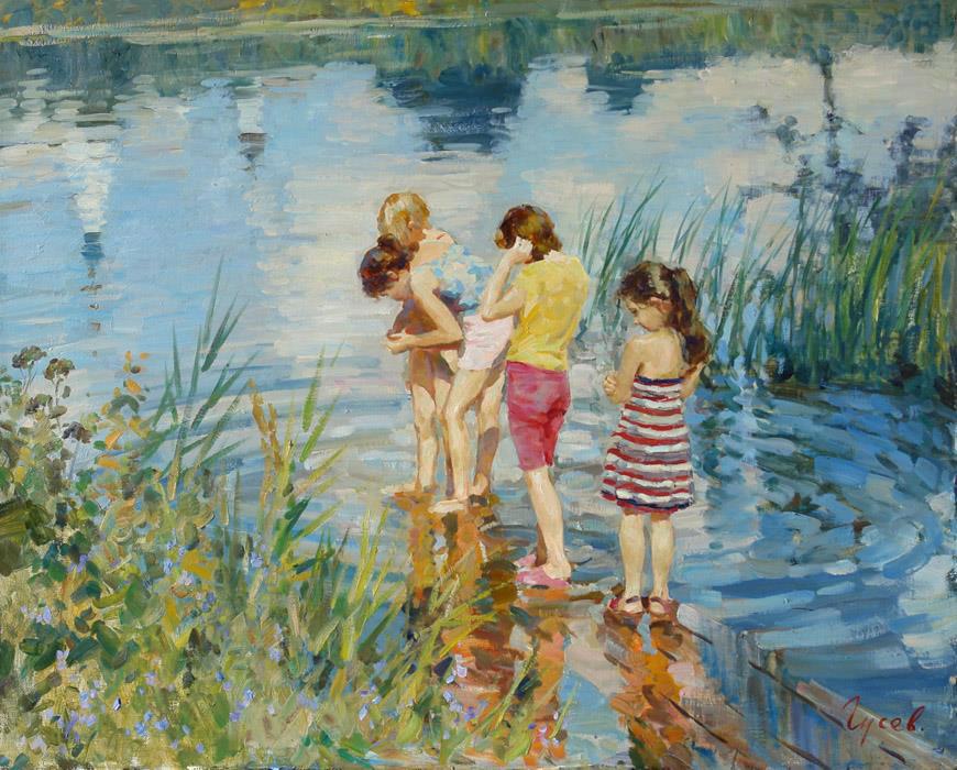 И сразу вспомнила о нашем современнике Владимире Гусеве. Сюжеты его картин различны, но все они светлые, солнечные. На них часто изображены дети или подростки. Причем дети всегда чем-то заняты. Ловят рыбу, моют игрушечные машины, катаются на велосипеде. Это дети - действие.