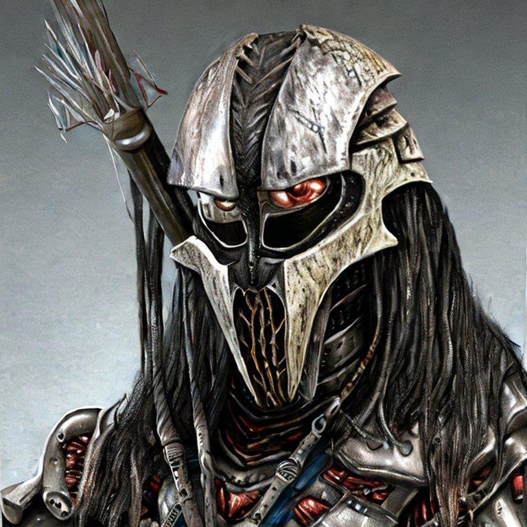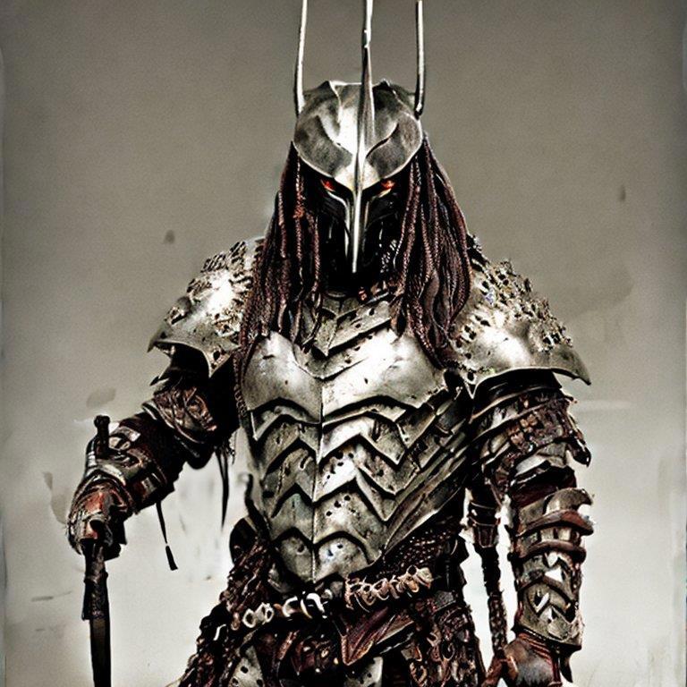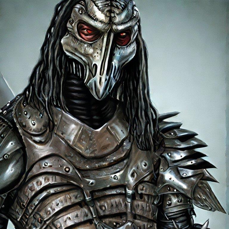 Хищник в образе рыцаря. Кстати, Stable Diffusion - единственная из всех нарисовала дредды, пусть и превратив их в волосы: