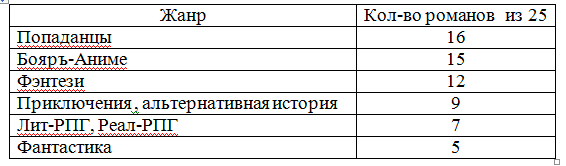 Такой вот у нас получился топ. Какие имеем выводы? Бояръ-Аниме и попаданцы лидируют с большим отрывом от от остальных жанров. И так, почему же люди предпочитают эти два жанра? На самом деле, всё очень просто. "Бояръ" практически всегда гарантирует максимально шаблонных, но крутых героев, угар, мясо, техно-магию и относительно глубокий лор. Так сказать - чтиво на массового потребителя (ч.т.д.). Попадацы - стандартный приём автора, направленный на эскапизм читателя, латание сюжетных дыр и тд. Вообще, это тема для отдельной статьи. Фэнтези и приключения - древнейшие (по нашим меркам) жанры, всё ещё держиться на плаву суровой хваткой, хоть и приходится их разбавлять "инородными" элементами. РПГ - без комментариев.