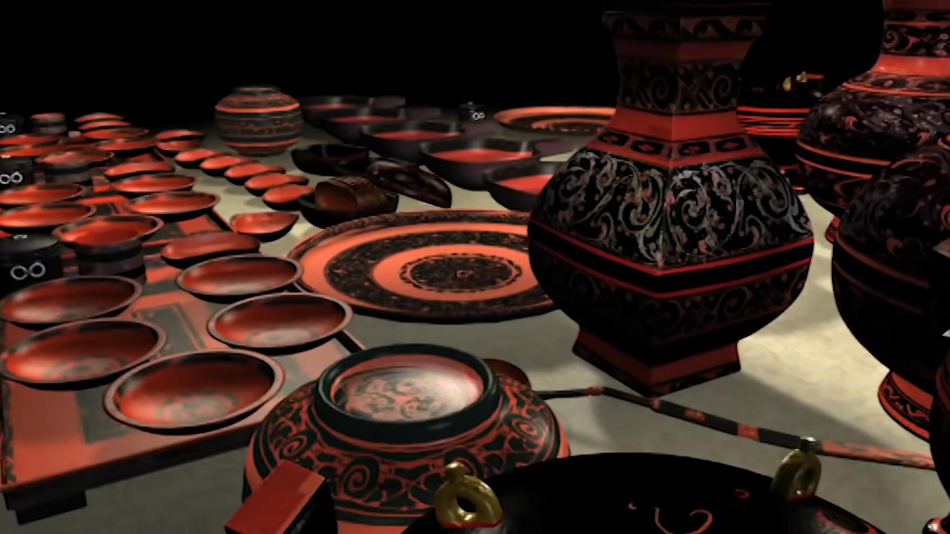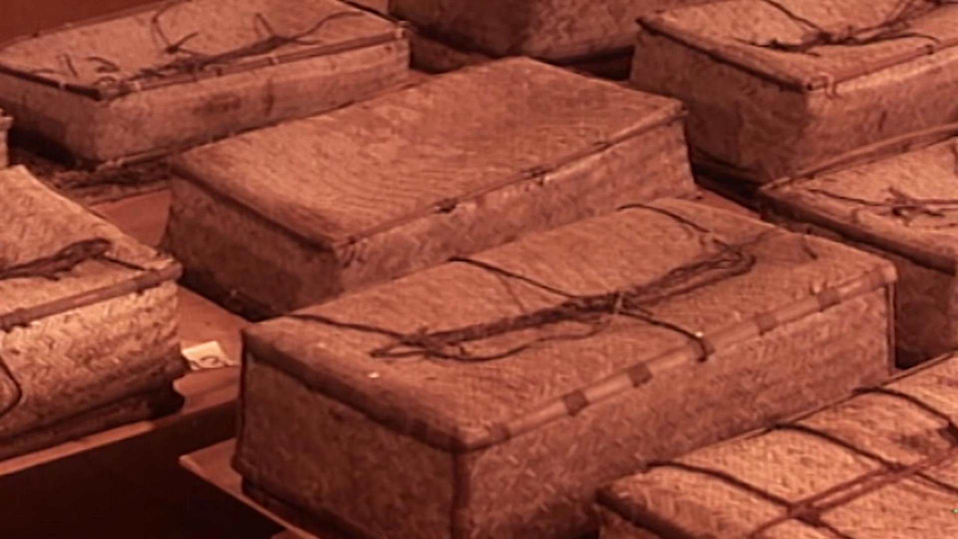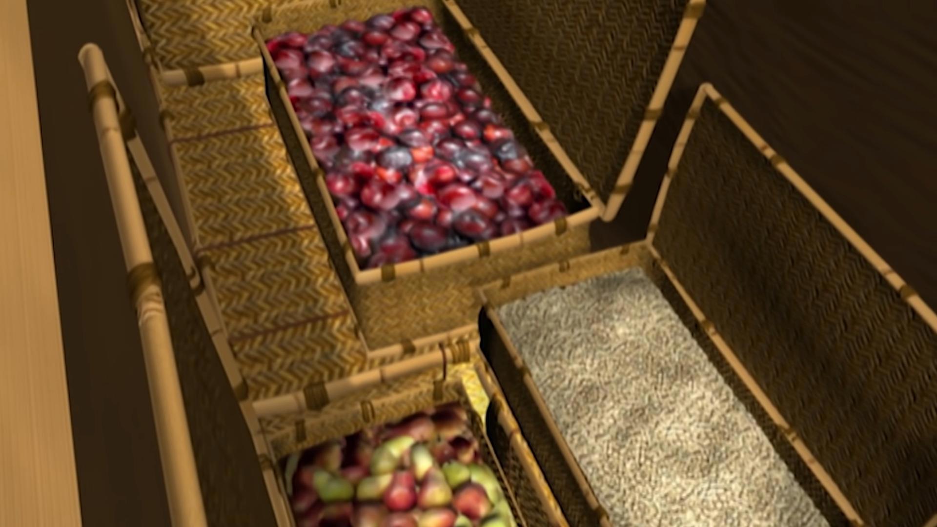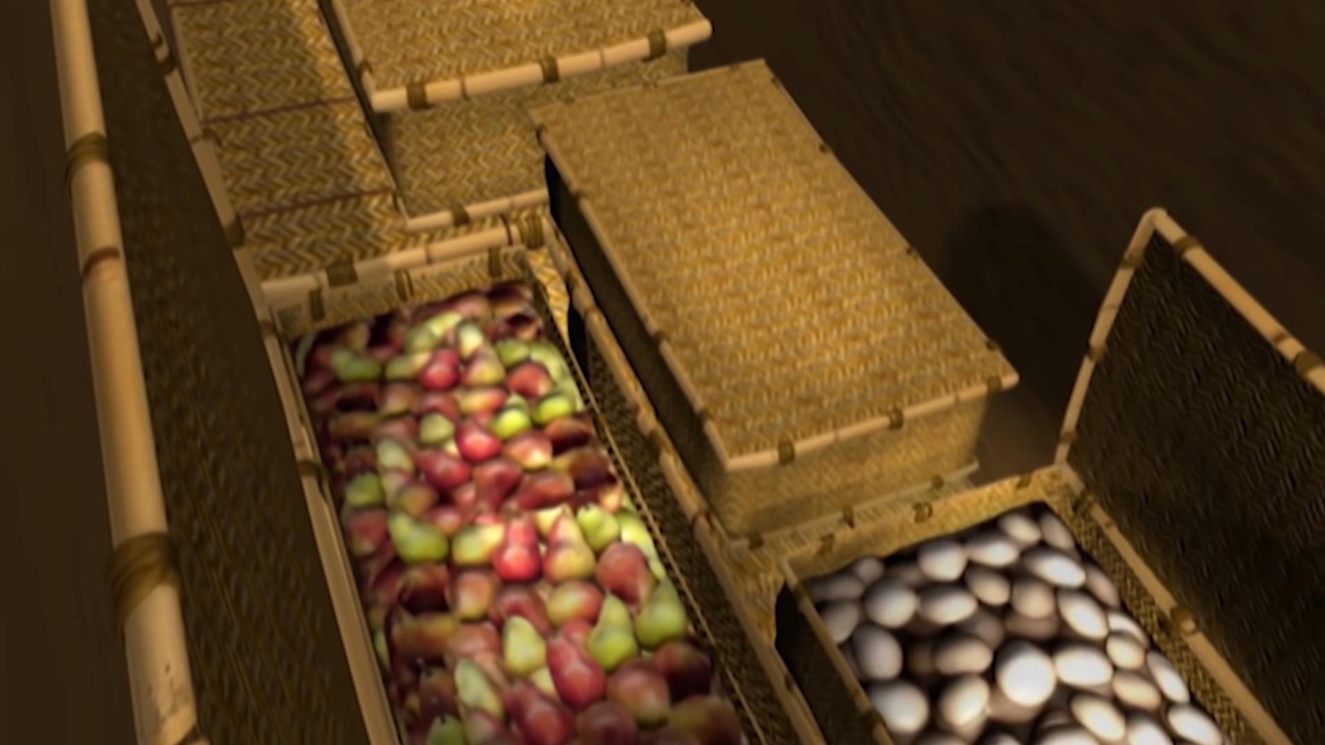 (всего 48 бамбуковых корзин и 51 керамический сосуд, заполненные едой, а также мешки с зерном и другой провизией)