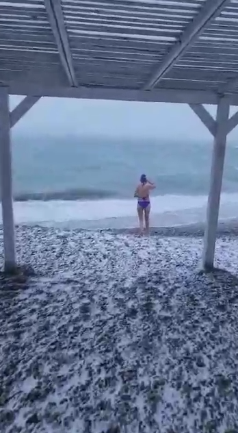Но не все. Несмотря на ураган, жительница Новороссийска Ирина Баранова решила не изменять своим привычкам и отправилась на городской пляж, чтобы искупаться в море. По припорошенному снегом берегу горожанка добежала до воды, окунулась по грудь, провела в море около 20 секунд и вернулась на сушу. Ирина Баранова ежедневно, при любых погодных условиях купается в море. Она уверена, что закаливание организма и правильное питание – залог здоровья и красоты." (с)