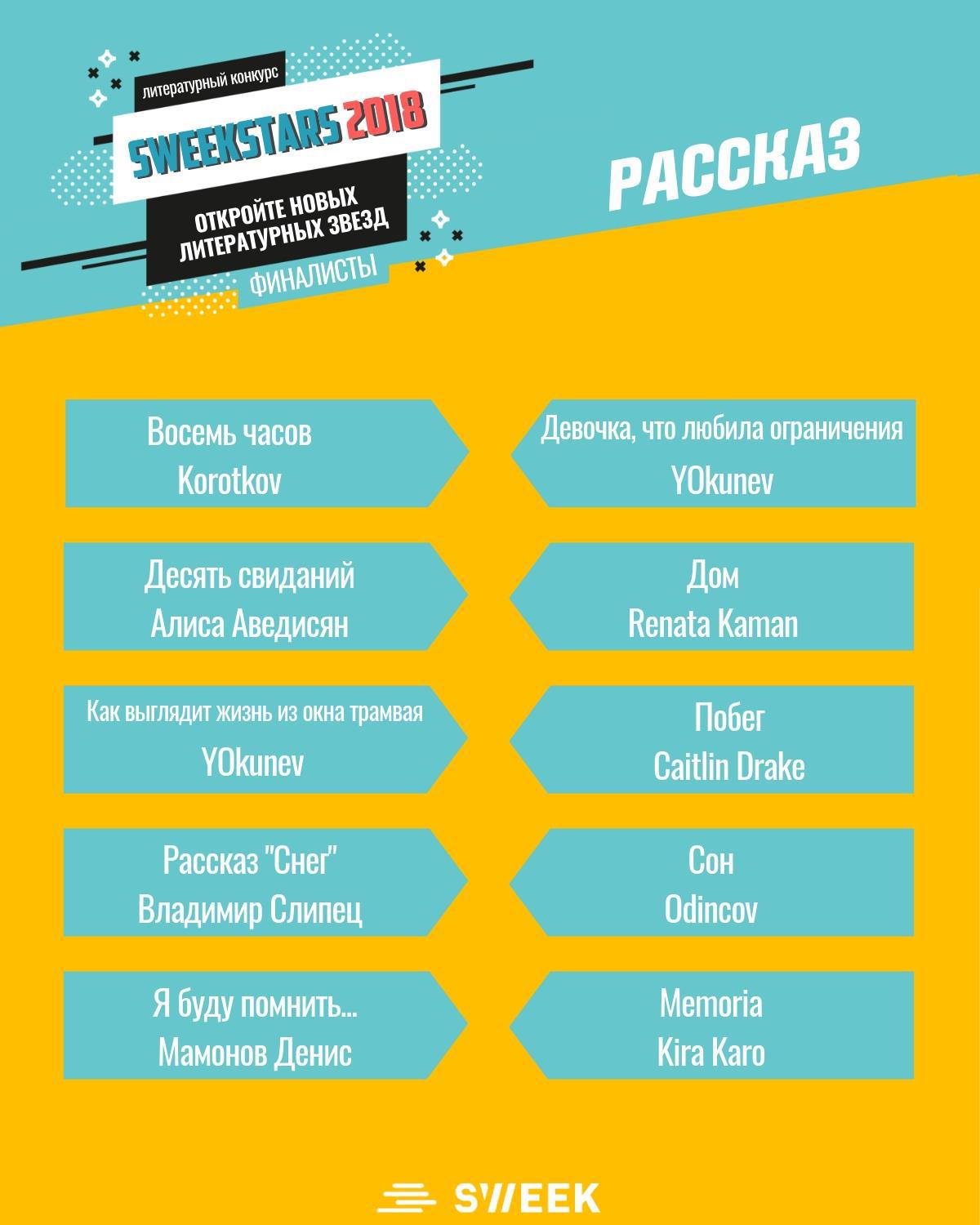 Автор: Денис МамоновС 18 октября 2018 года по 21 января 2019 год - можно было принять участие в конкурсе SweekStars 2018. Условия простые: принимались любые произведения в неограниченном количестве от одного автора и даже опубликованные, главное, чтобы они нигде не занимали первое место. Ну а что? Почему бы и не кинуть свои рассказы на этот конкурс?