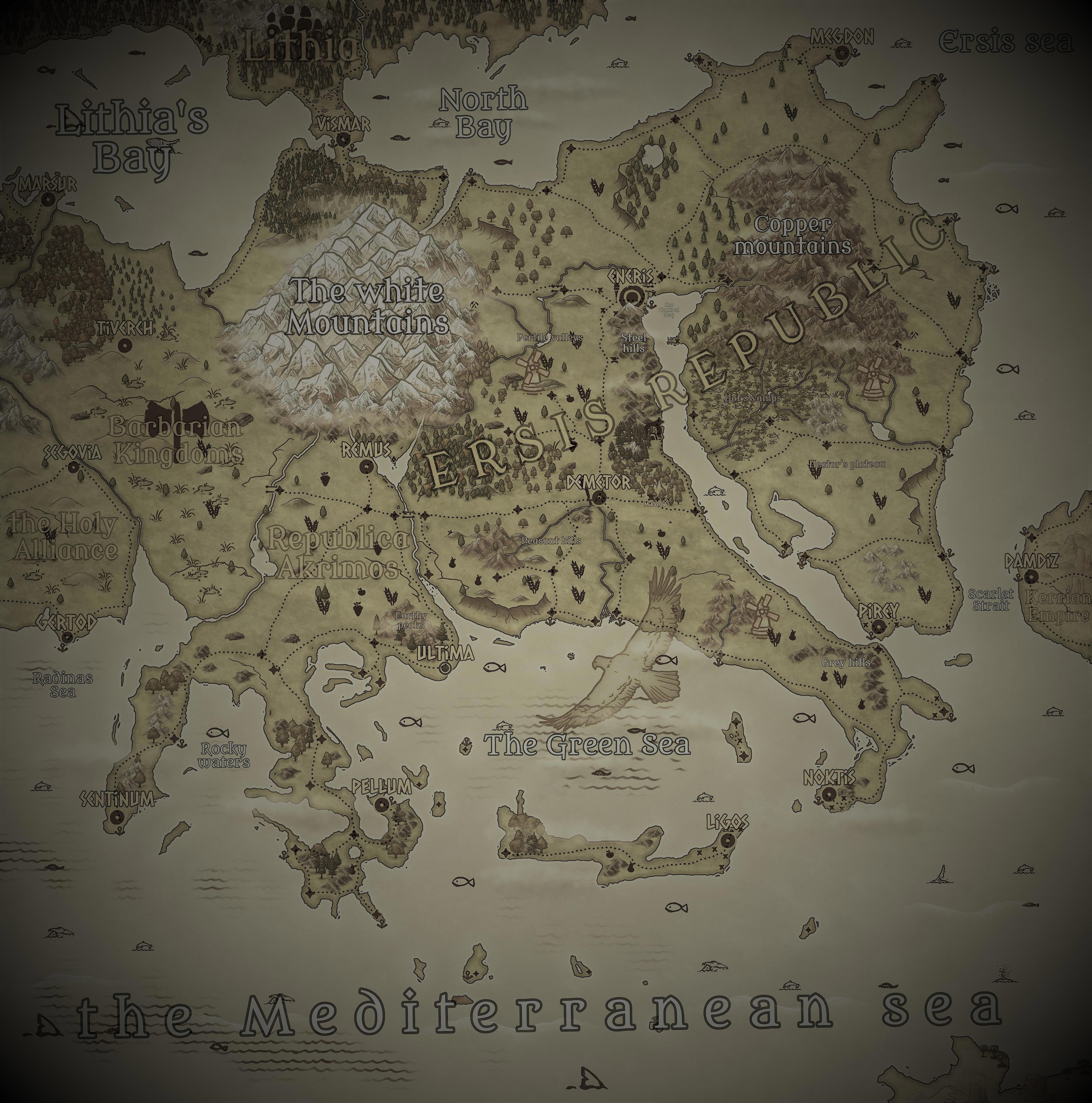 И тут появляется первая сложность: чем больше вопросов, тем больше вопросов... как бы абсурдно это не звучало. Но это так. Но именно так происходит наполнение вселенной. Море? Почему оно средиземное? Потому что разделяет два здоровенных куска суши. А что за суша? Мир архипела? Нет - это Пангея - единый континент. Почему Зеленое море? Потому что зеленые водоросли на побережье. Почему оно отеделно от средиземного? Отделено островными архипелагами. Почему алый пролив? По той же причине, но другие водоросли. Почему море цветет? Потому что зона субтропического и средиземнорского климата. Почему белые горы? Потому что снегом покрыты всегда. Почему всегда? Потому что высокие как гималаи. Почему Ремус? Потому что основатель города царь Рем. Почему медные горы? тут и так понятно, ну и всё в таком духе - эту тему можно развивать бесконечно. Каждое обозначение, каждое название - всё должно иметь свой смысл и историю.
