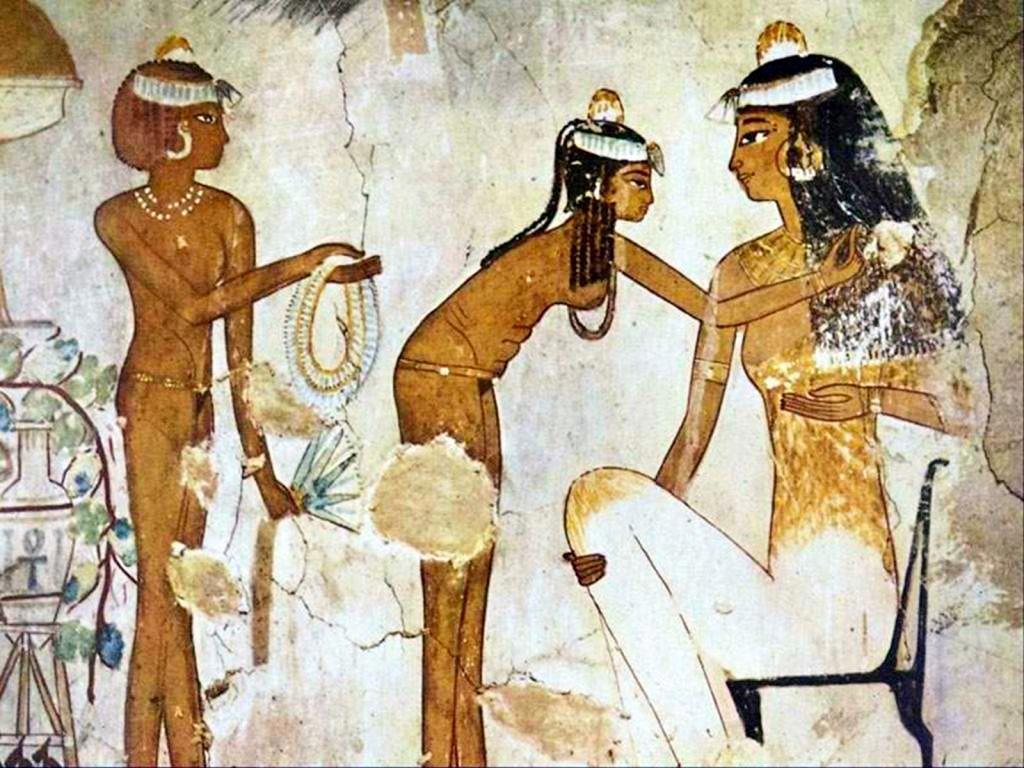Есть ещё материалы из того страшного далёка, кроме греческих. Вот, например, фрески египтян, которые тоже вроде бы имеют от историков титул «древне...» тоже изображают своих женщин в довольно минималистических нарядах. Хоть и не всех, но всё же. Вот такая фреска: