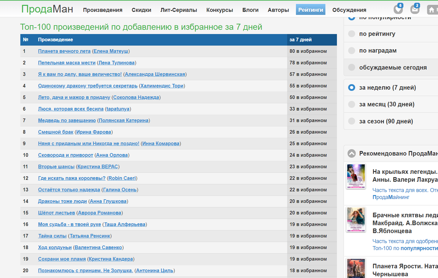 Тут к месту как раз похвастаться😀 На Продамане, где я выложила пролог новой книги в новом для меня жанре научной фантастики, уже 3 дня моя книга держит 1 номер в Топе-100 за неделю.