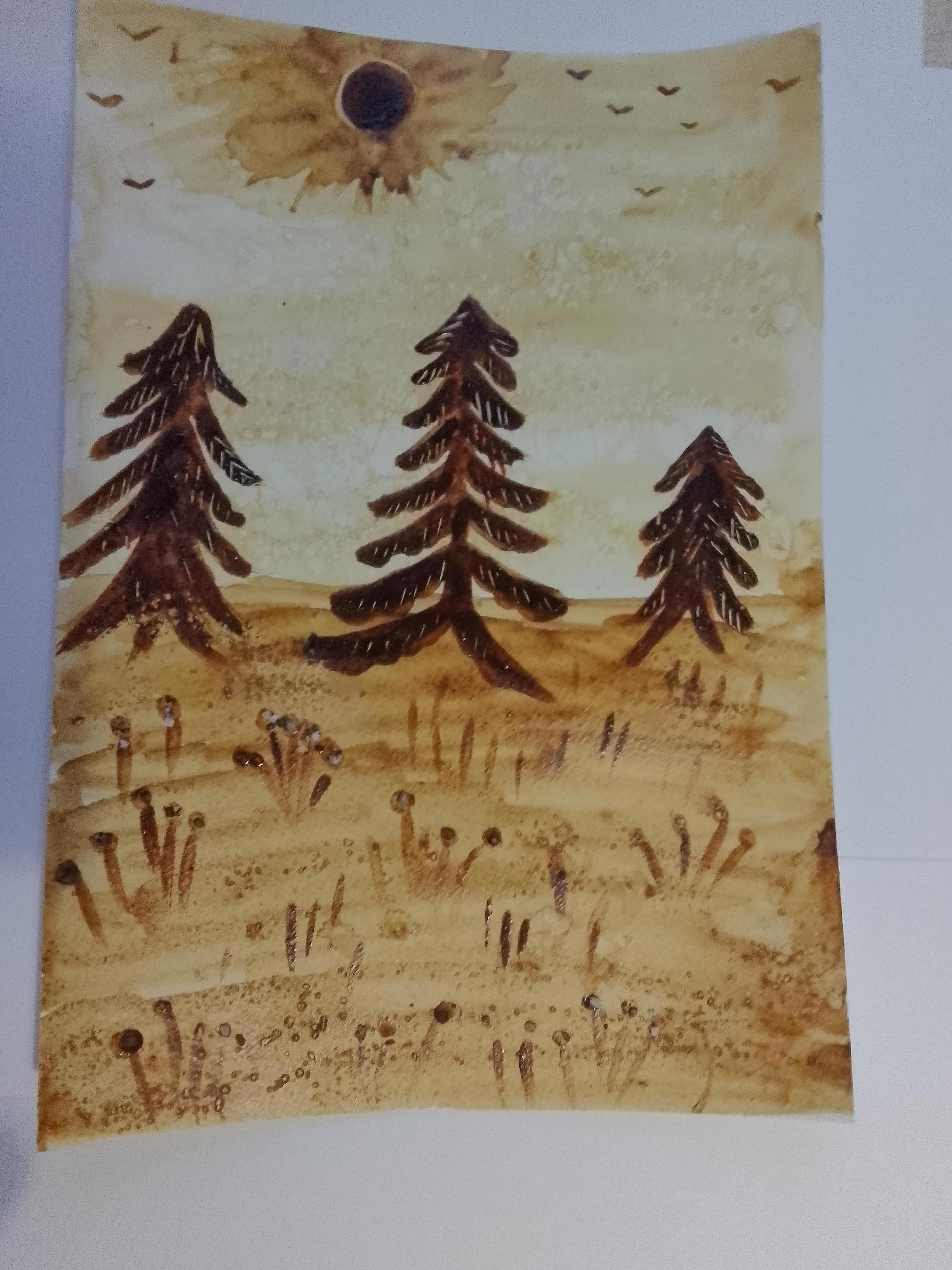 Утро. Шесть часов. Все спят. Тишина. И вот иду на кухню, беру заранее приготовленный раствор кофе, но не для того, чтобы выпить чашечку бодрящего напитка, а для того, чтобы рисовать. Рисование кофейными красками является увлекательной техникой. Я к тому же ещё использовала соль. Если крупицы соли насыпать на ещё влажную краску, они начинают её разъедать и получается интересная пятнистая фактура. Так можно изобразить снег, пузыри, цветы, чешую.