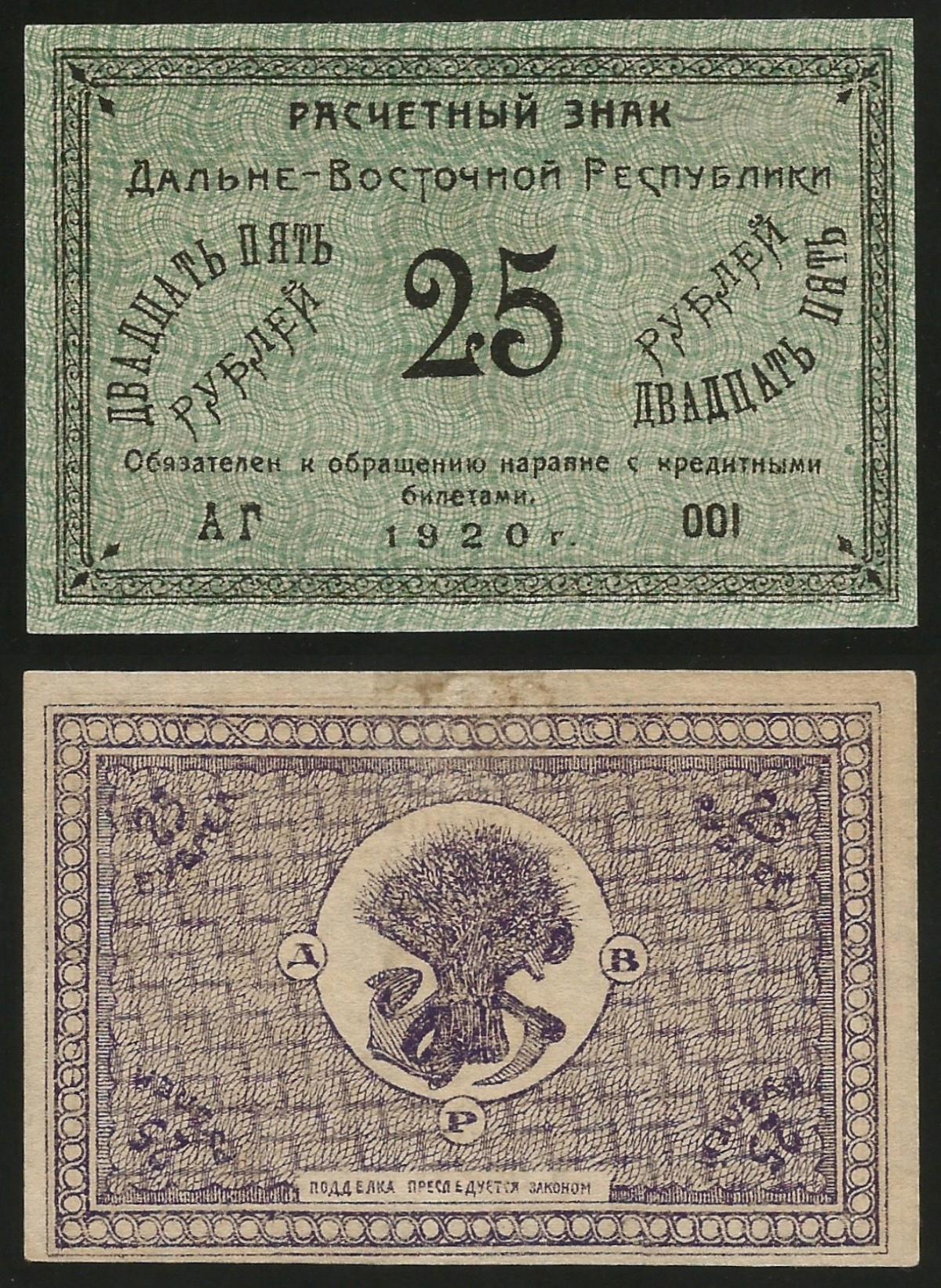 Известен еще один денежный выпуск, осуществленный от имени ДВР - так называемых расчетных знаков номиналом в 25 и 50 рублей (фото из интернета):