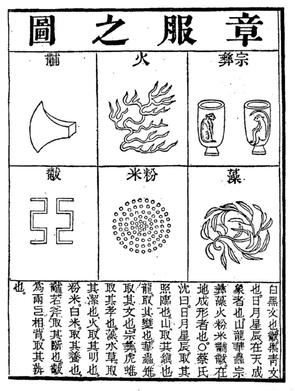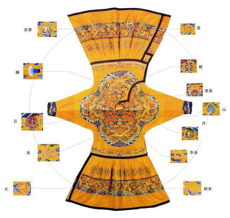 "Хочу видеть знаки древних: солнце, луну, звезды, горы, драконов, цветы и птицы, чтобы они были изображены на верхней одежде, ритуальный сосуд 宗彝, водяные травы, огонь, зерна, топор 黼 (фу), 黻 (фу, символ из двух луков), чтобы они были изображены на нижней одежде. Я хочу, чтобы они были изображены в пяти цветах и были официальной одеждой. Мне до лампы, как вы это сделаете, лишь бы было красиво."
