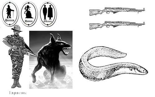 Тут случилась очередная рутинная неприятность, скисла проводная связь, а рацию нам так и не доставили. Командир, оставив старшим капитана Тараканова, взял Уазик и уехал в штаб ругаться. А Тарасюк истово взялся за выполнение нарядов. Он покрасил ворота в строгий зеленый цвет, нарисовал на створках по красной звезде в желтой окантовке, но перед сортиром впал в задумчивость. Данное удобство было каменным и оштукатуренным, то есть - на стены тут просилась явная побелка, но вот с дверями Тарасюк задумался, ибо их было три штуки (хотя все они вели в одно и то же помещение). А тут, как всегда, к старшине подкатил с предложениями помощи вездесущий Аким. Он напомнил Андрею, что командир приказал сделать так же, как у немцев, а у немцев были именно трехдверные туалеты. Двери у них были ярко-красные, и на каждой двери была специальная немецкая туалетная надпись, которую, к счастью старшины, Аким помнил наизусть и с радостью напишет её на бумажке и даже набьёт контуры специального сортирно-готического шрифта. Так что, когда усталый, но честный старшина отправился отдыхать, на дверях сияли надписи: FЭr die Herren, FЭr die Damen, FЭr die Offiziere (для Господ, для Дам, для Офицеров). А Аким, довольный, как удав, взял СКС и пошел на пост у ворот, ибо в связи с особой литерой груза, караульная службы была на нас, и как раз была его очередь.