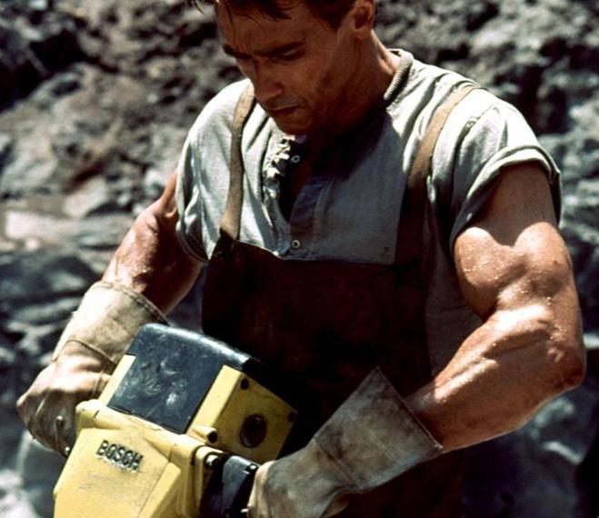 Что главное в фильме с молодым Шварцем? Верно, его могучие мускулы и неважно, как их показывать: раздеть ли догола за-ради эффекта, всучить бревно или дать перфоратор. Дядя Шварц - это вам не Саша Курицын, ему имелось что показать, круто и выгодно, поблёскивая то ли потом, то ли маслом и одним видом стимулируя молодёжь на посещение спортзала.