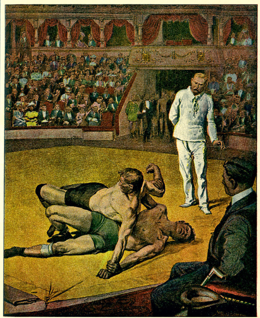Начал он ещё и махать руками. Банковские билеты выронил и они по арене разлетелись.