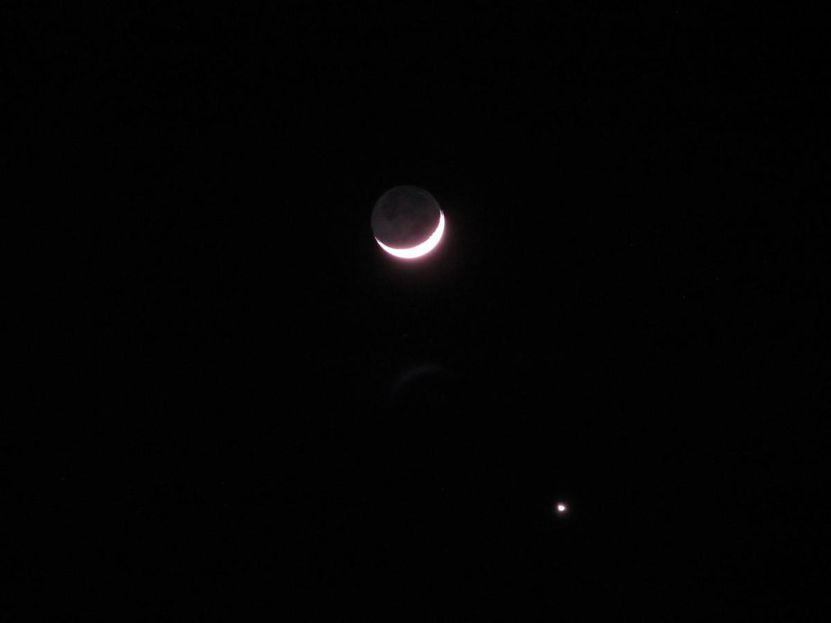 Соединение Луны и Венеры 24 марта 2023 года. 19:51. Снято на ультразум Canon SX150IS. Отменно отработал стабилизатор. Отчетливо видно "пепельный свет" - освещение темной стороны Луны светом, отраженным от Земли и фазу Венеры.