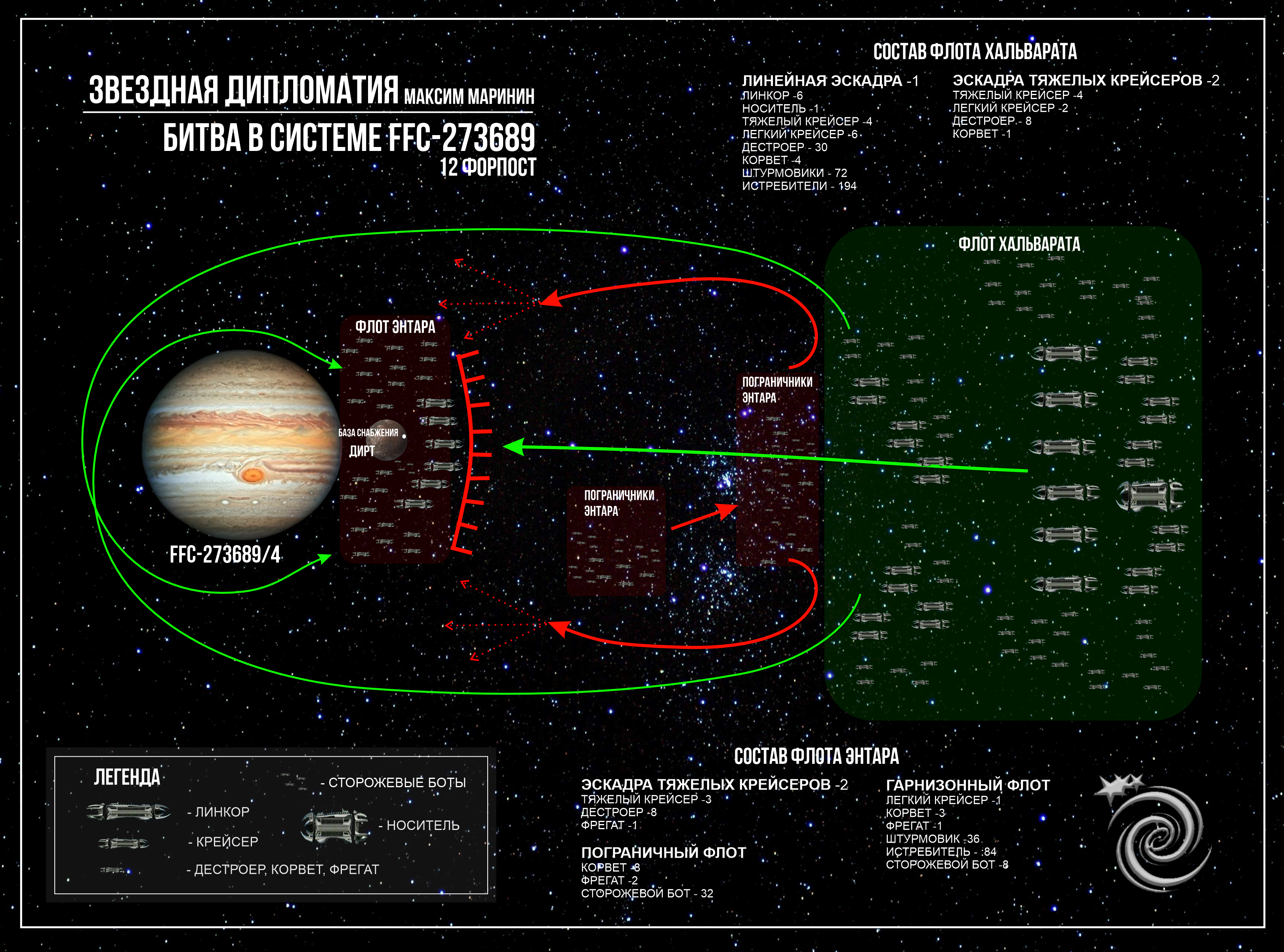 Первая эскадра тяжелых крейсеров Хальварата входит выходит из гиперпространства в системе FFC-273689 на территории Энтара. Находившаяся поблизости энтарская пограничная флотилия, не знающая еще о масштабах вторжения, смело принимает бой, но под давлением превосходящих сил противника вынуждена отступить. Крейсерская хальваратская эскадра преследует бросившихся врассыпную пограничников Этнара. Спешащая на помощь вторая пограничная эскадра энтарцев сталкивается с выходящей из гиперпространства еще одной эскадрой тяжелых крейсеров Хальварата и отступает не дав боя. Вслед за авангардом пространство системы FFC-273689 входит линейная эскадра и набирая скорость движется к четвертой планете системы, газовому гиганту, где расположен форпост энтарцев.