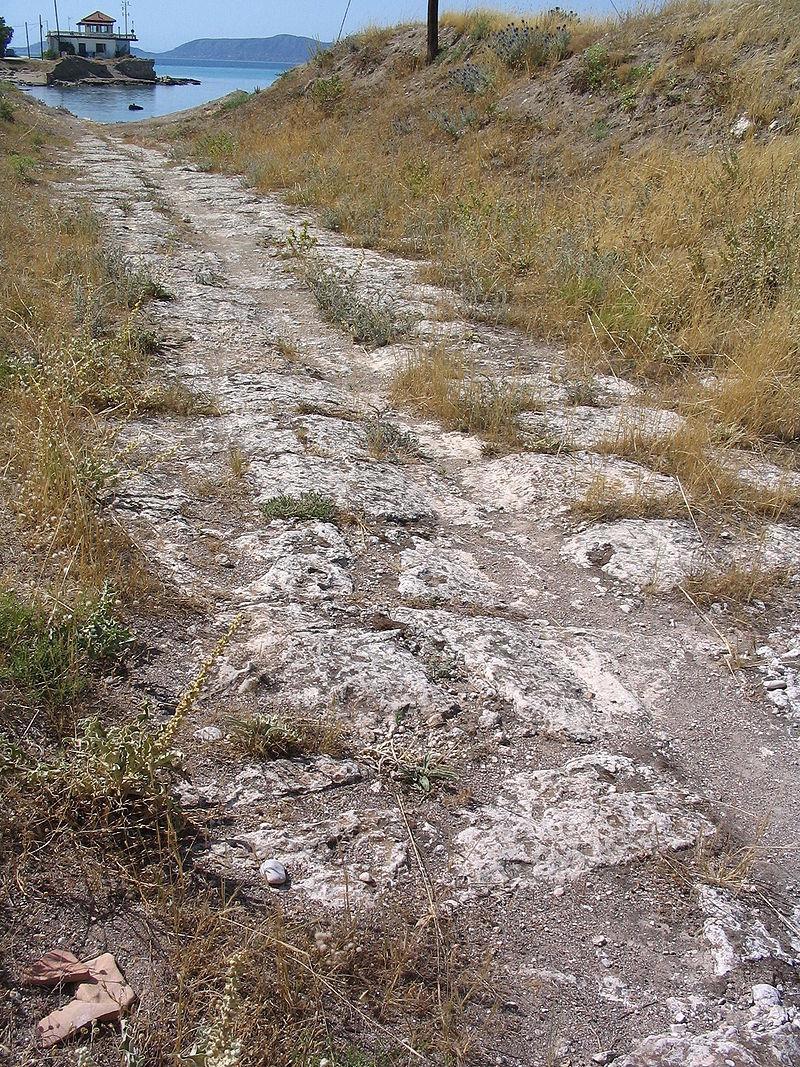 Это дорога мощёная каменными плитами с глубокими желобами, в которые помещали деревянные полозья, смазанные жиром.