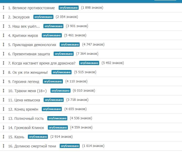 Вот в этом сборнике у меня 60 рассказов. Некоторые, как видите на скрине, вовсе по 2К. Вот и на хрена такие микро-рассказы выкладывать отдельно? Чтоб больше лайков срубить? Да не читает тут бОльшая часть аудитории рассказы! А на странице автора, где 200-300 произведений вывалено, копаться тоже большинство не будет.