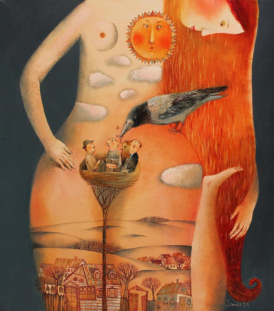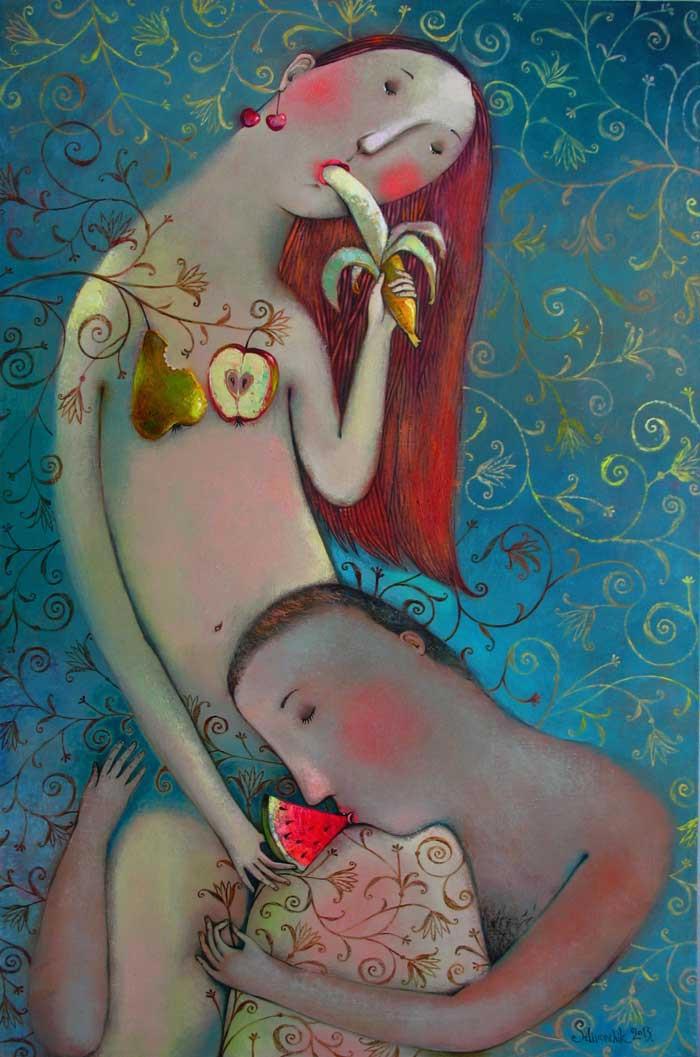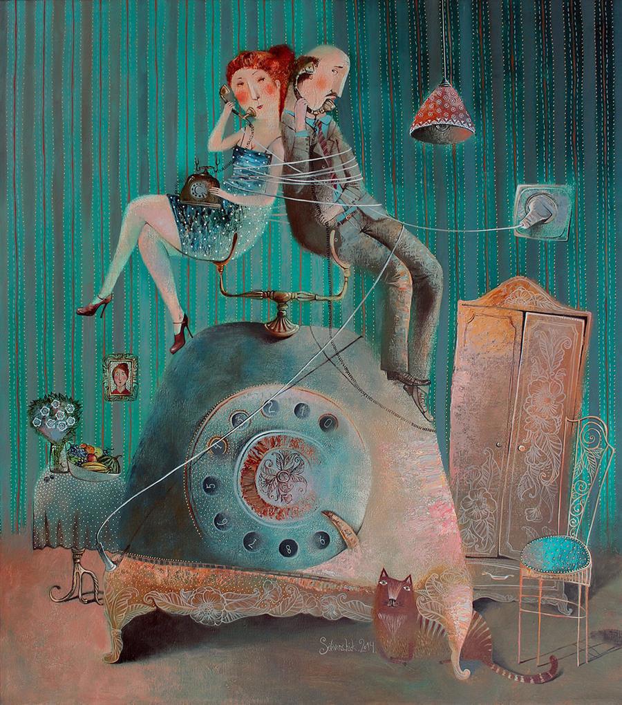 Автор: Элиза ГвиччиолиВ работах белорусской художницы Анны Силивончик соединились и фантастический реализм Марка Шагала, и наивное искусство пимитивистов начала ХХ века, и народное декоративно-прикладное искусство и фольклор.