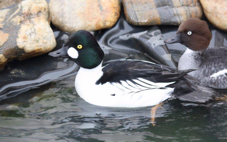 Ребята-а! Красота неописуемая! Туловище – чёрно-белая графика, на голове –  изумрудно-зелёная шапочка, а лапы – ярко-красные. И золотые глаза. Англичане их так и называют «золотоглазые».