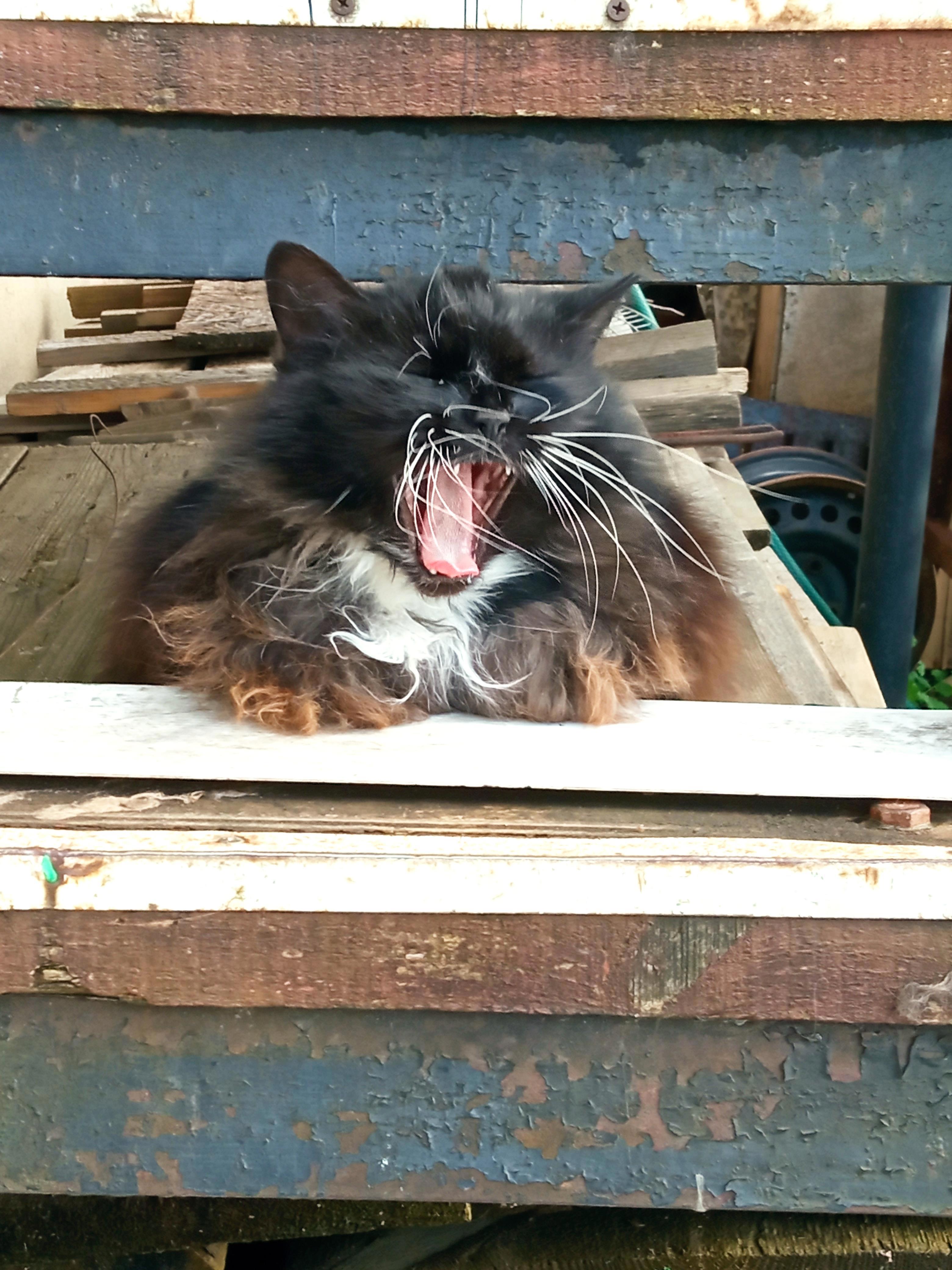 Заходил к родителям, заметил кота, отдыхающего между ступеньками лестницы. Пока прицеливался с фотоаппаратом, он зевнул, и вышло вот что. Настоящий монстр.