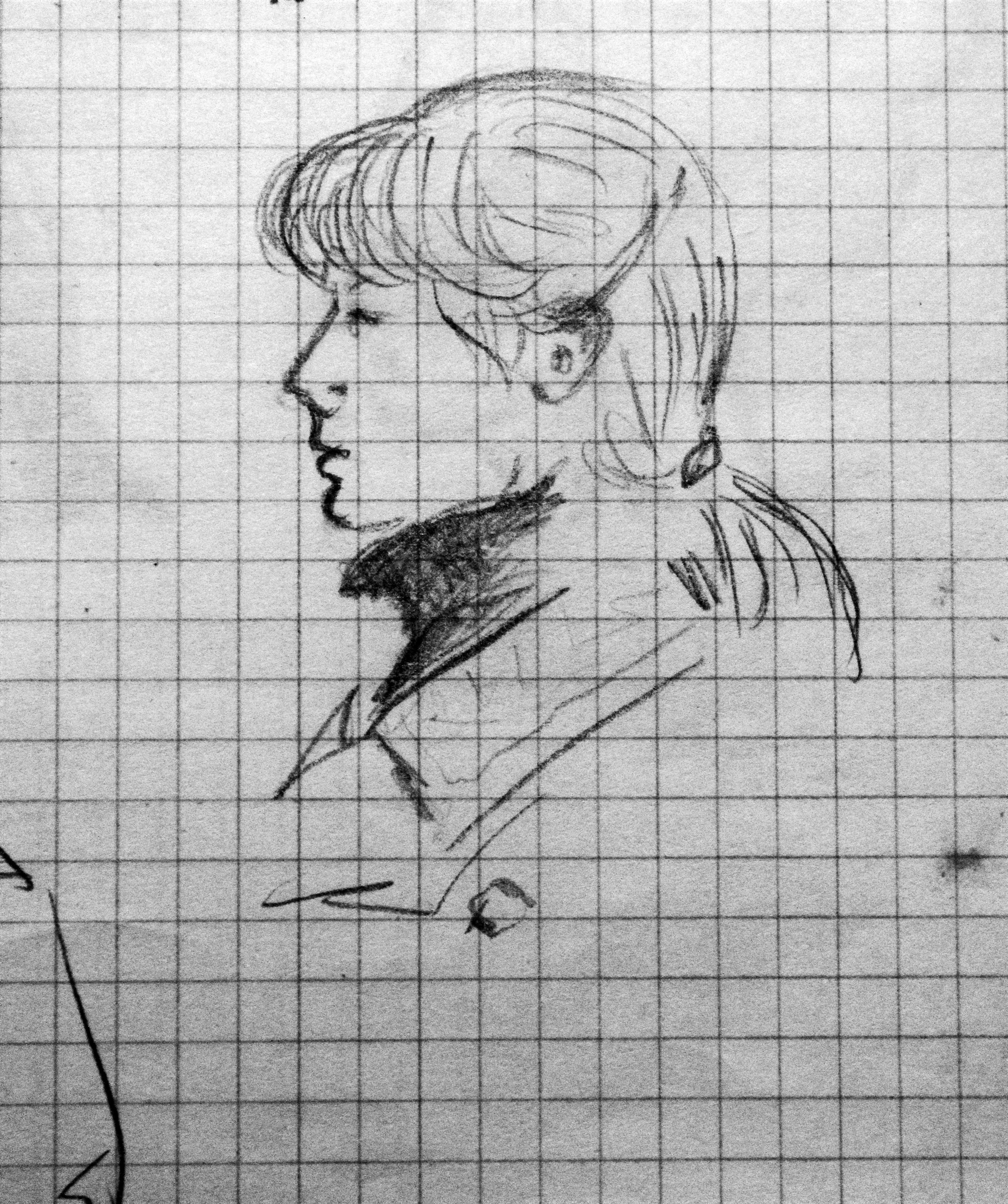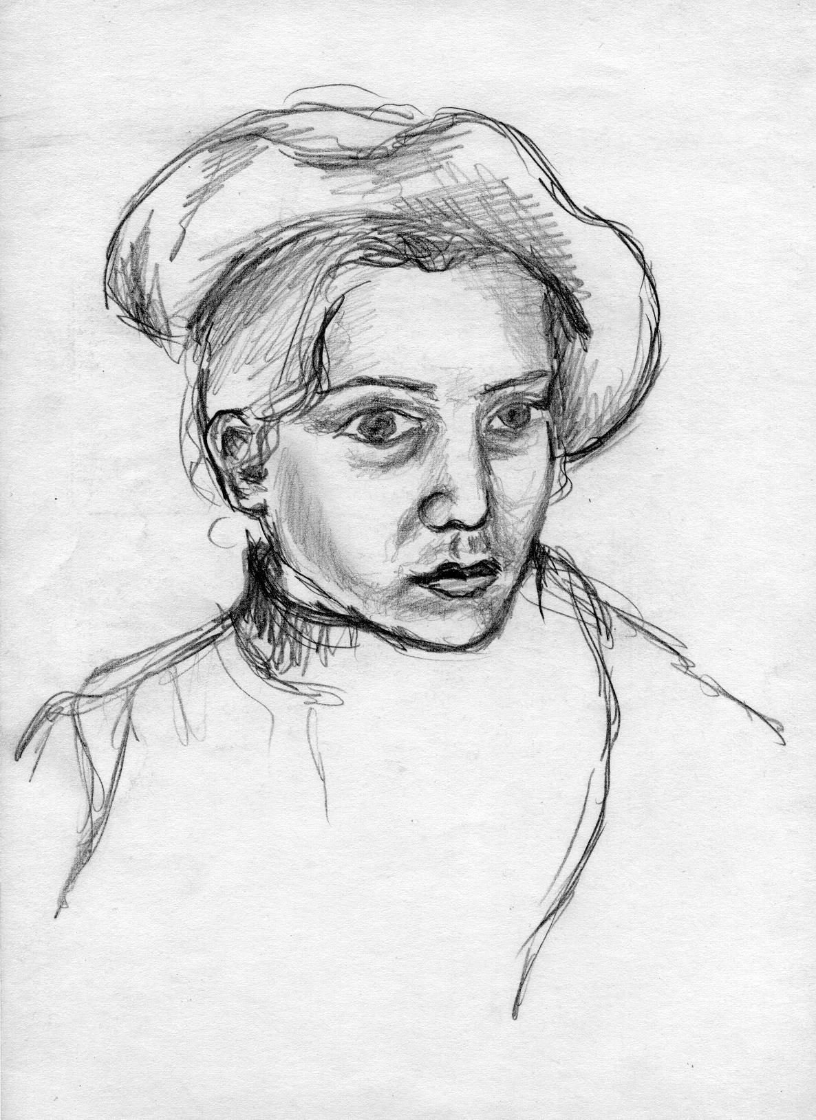 К тому же люди, которых я знала, о которых слышала и читала, вели весьма активную жизнь. Они изобретали, писали, играли на музыкальных инструментах (а некоторые их еще и делали), пели и танцевали, занимались спортом, строили, выращивали сады, короче — вели нормальную творческую жизнь. В детстве для меня было удивительным открытием, что, оказывается, так живут не все. Но впрочем, не будем о грустном. Вот — автопортрет в 13 лет. Наверное, мне повезло. Повезло с родными. Повезло с воспитателями детского сада. Со школьными учителями. Представляете, учительница рисования в школе водила нас на этюды, учила делать кукол в народных костюмах и делать росписи по дереву. Вот один из рисунков с этюдов. Нам всегда говорили: "Не пытайтесь изобразить все детали, начните с общего облика — попытайтесь ухватить его".