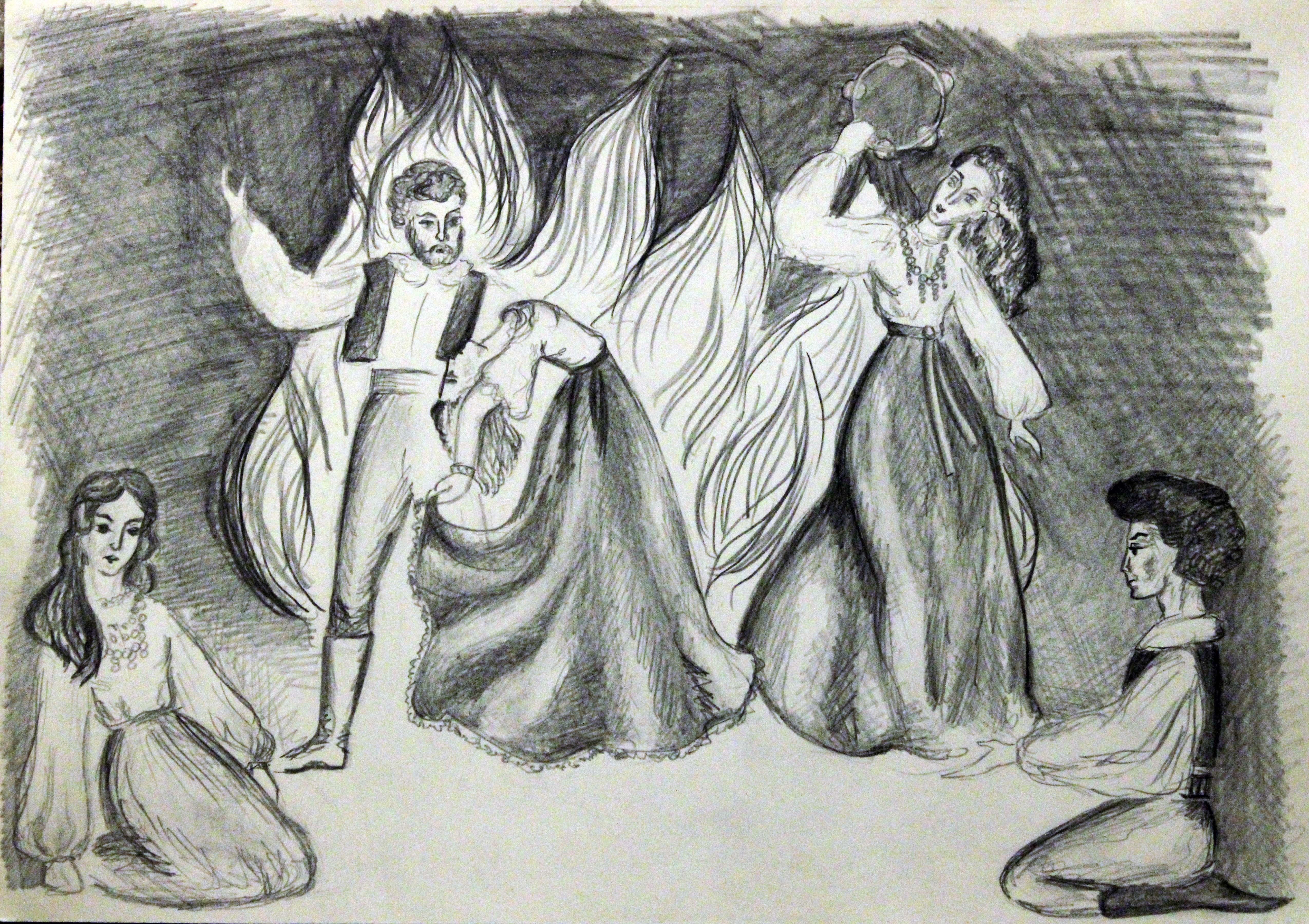 А потом иллюстрации к Шекспиру (в 8 классе на экзаменационном сочинении я писала именно о нем), к Гарсио Лорке, Бомарше, греческой мифологии...