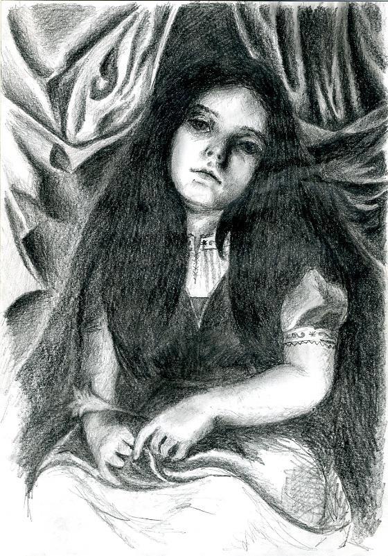 А бывает, пытаешься отдать дань уважения прекрасному художнику, а потом оказывается, что нарисовала собственного персонажа. Этот рисунок я назвала "Воспоминание о Сурбаране". А потом решила, что это маленькая Соланж де Сен-Жиль из романа "Бог, король и дамы!" (простой карандаш):