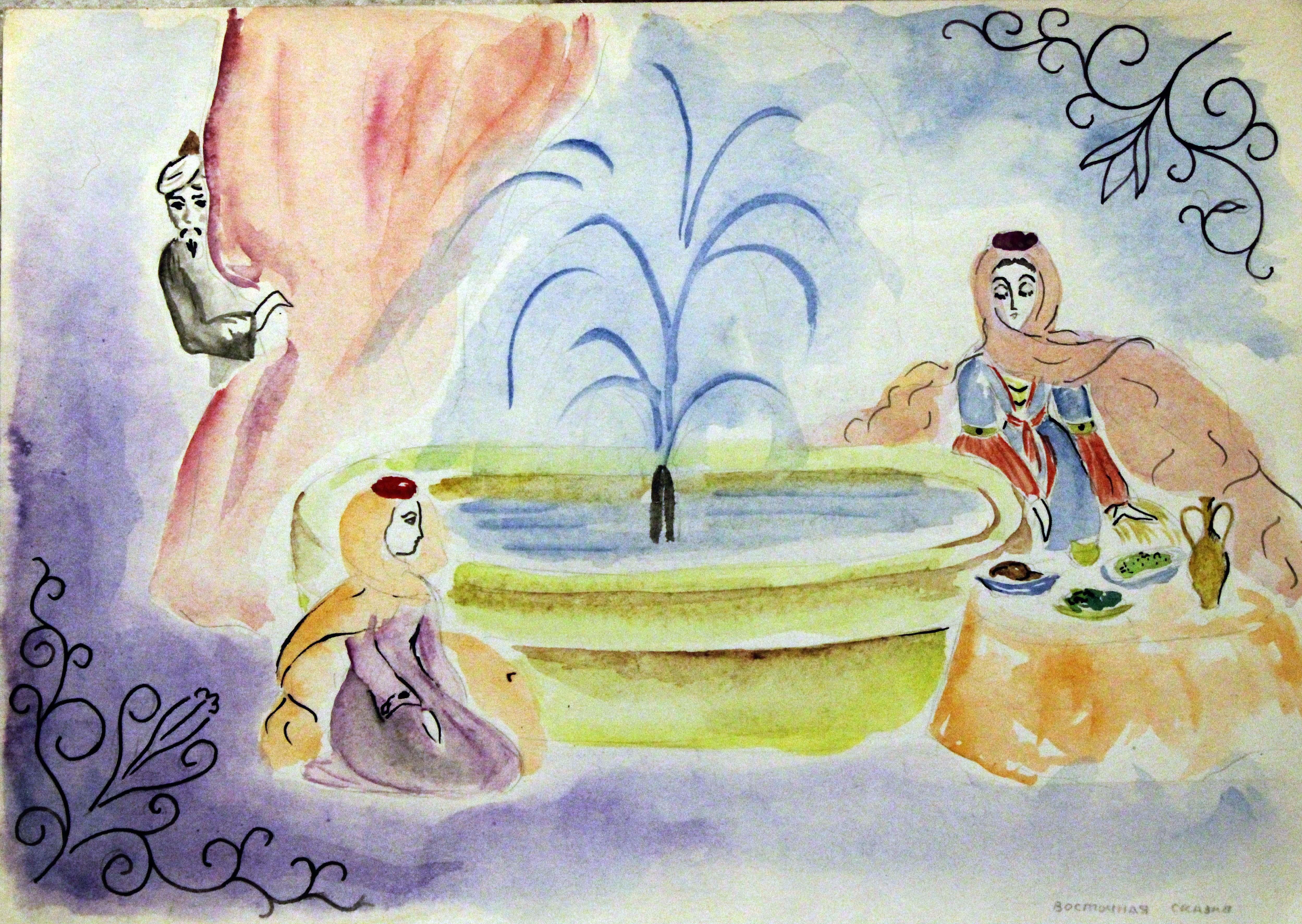 Сначала, как и у всех детей, иллюстрации к сказкам. Вот к примеру — восточная и цыганская (не помню, писала ли я, что дома у меня огромная подборка сказок и эпоса народов мира — три большие полки!):