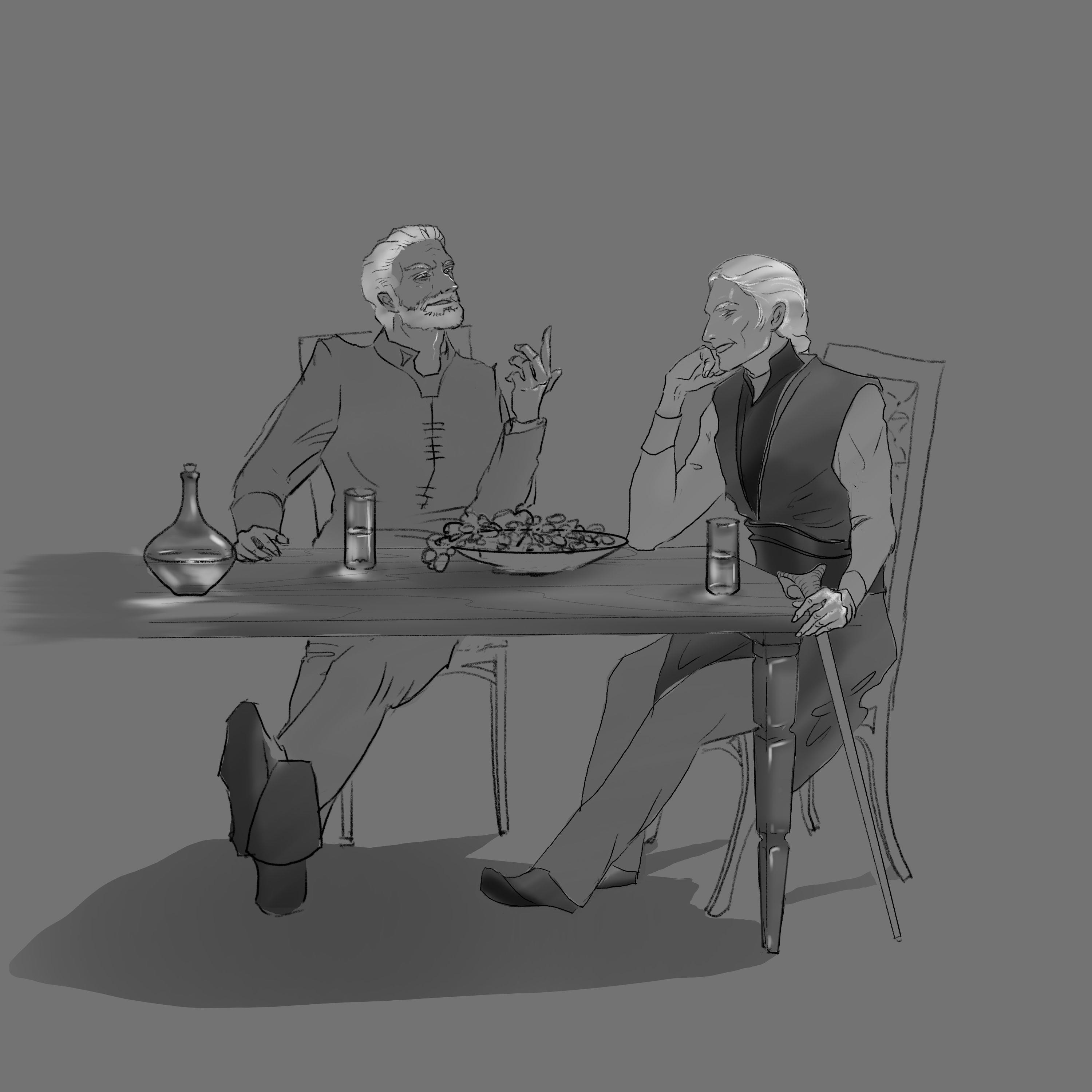 Раструб шерстяного плаща одного из попутчиков повернулся в сторону звука. Путник поднял руки и опустил раструб на плечи. Второй из группы остановился и сделал то же самое. Род придержал коня. Под капюшонами оказались не менее чудные люди. Волос у обоих был как будто бы сед, цвета лунного блика на стоячей воде, но на лицо оба беловолосых были молоды. Один, тот, что дальше стоял, с густой величавой бородой серебряного цвета. Глаза — светлые, почти белые, точно волосы, смотрели прямо, без страха. Род грешным делом подумал, не Эйсенгард ли спустился на землю и смотрит на него, но погнал от себя эти мысли. Второй — безбородый, лицо его было красиво и чисто, черты — словно нарочно выведены неизвестным художником, а глаза точно такие, как у первого. Род даже подумал, что пришли эти люди не от этого мира. Не демоны ли вернулись на землю?
