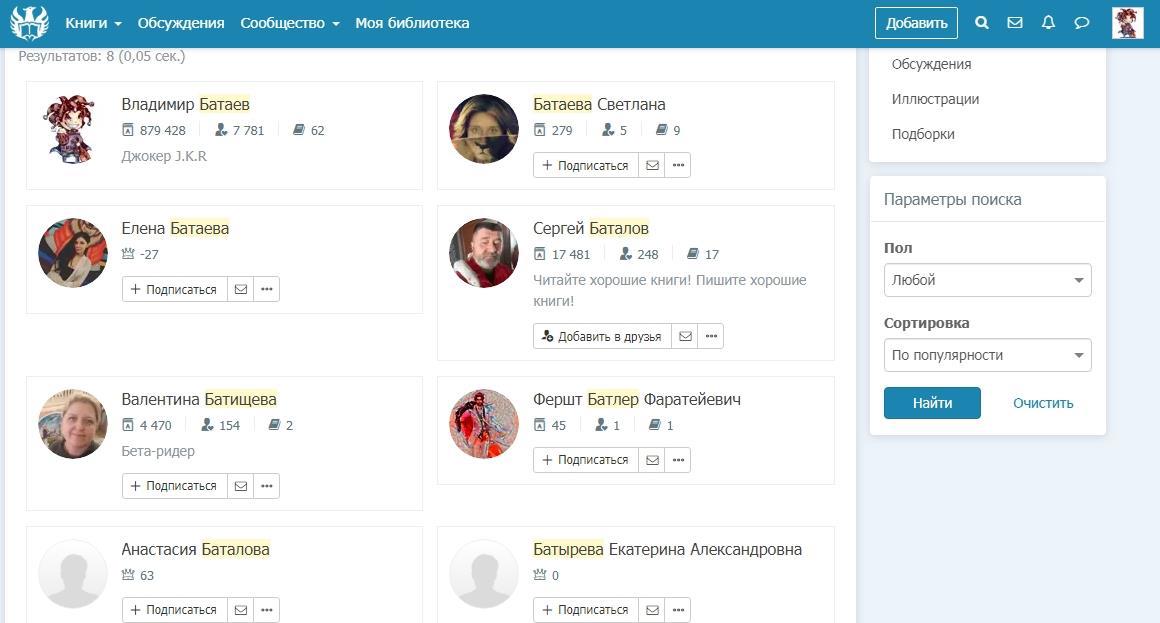 Увы, на АТ, похоже, полностью отключили поиск пользователей, не являющихся авторами. Во всяком случае, найти этого читателя я не смог. А было бы интересно на его профиль взглянуть...