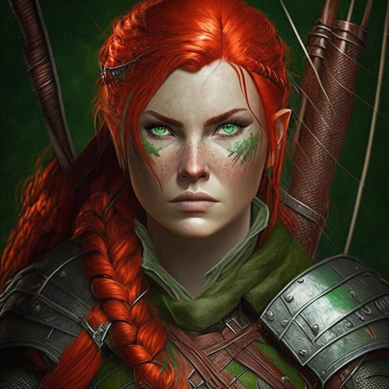 Первой, на которую наëмник обратил внимание, была девушка сидящая справа. Во-первых, у неë были огненно-рыжие волосы, схваченные в длинную косу. Во-вторых, еë костюм был самым открытым. Девушка была одета в кожаные штаны, на бедрах располагались длинные кинжалы. Поверх недлинной туники бежевого цвета, был надет жилет из темной кожи. За спиной у девушки виднелся колчан, полный стрел, и лук.