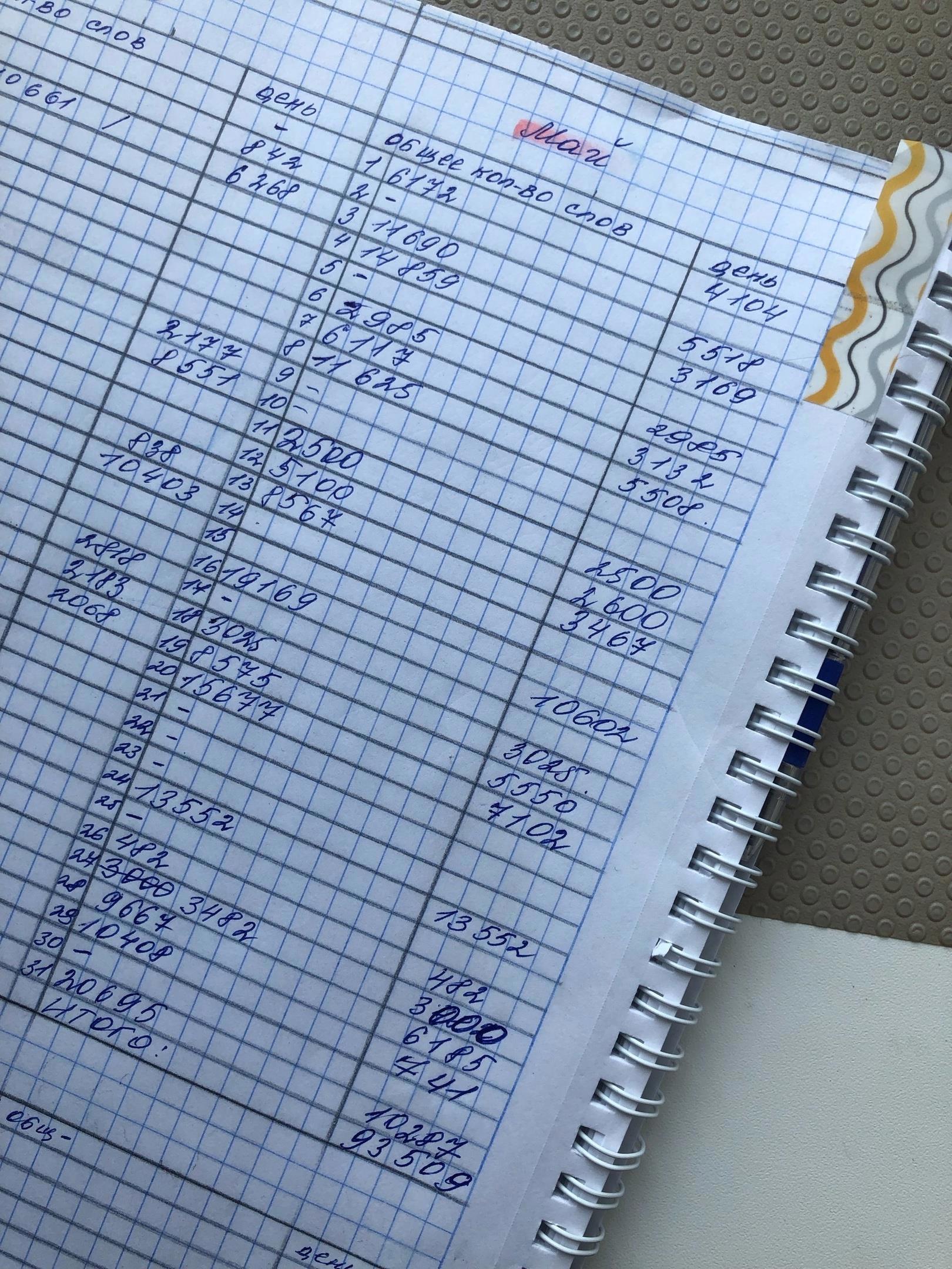 Никогда не рассказывала, что веду писательский трекер. В нем совершенно нет ничего необычного. Он начерчен в тетради от руки, почти никак не оформлен и предназначен для того, чтобы помогать рассчитывать прогресс написания "Дела о Черном Удильщике"