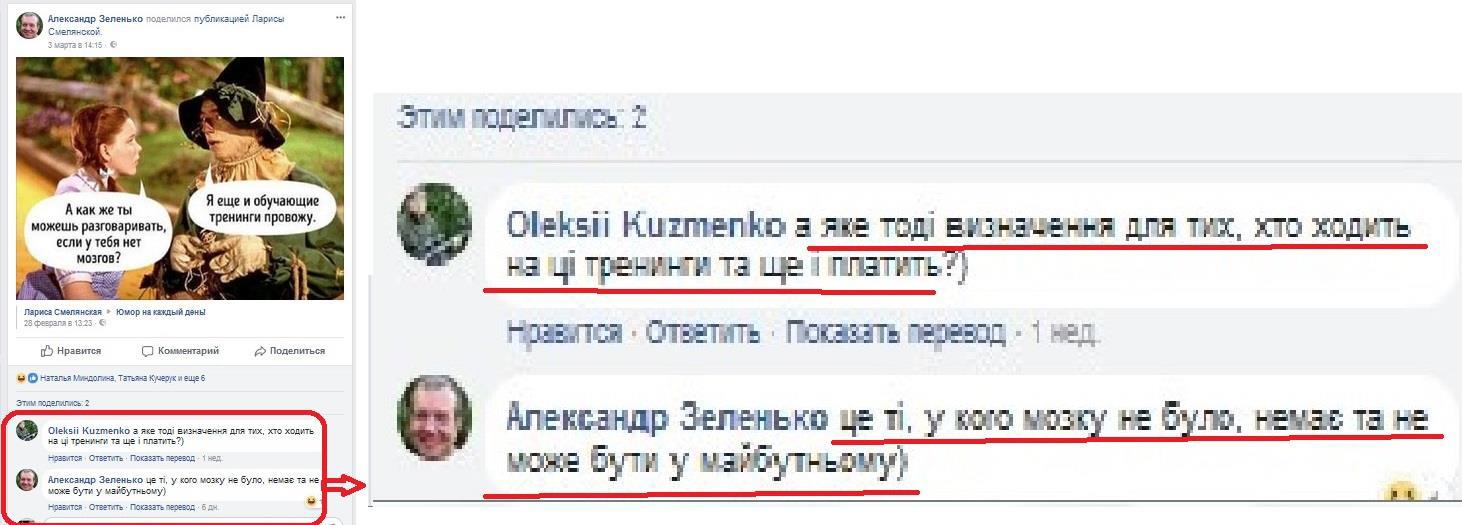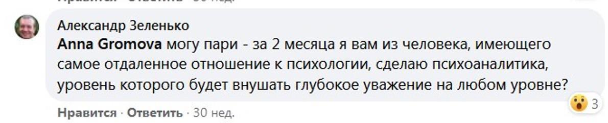Одно из важнейших качеств, которые позволяют нам сохранять себя в мире, где практикуют паны Зеленько, это уметь понимать между строк. Вот и на его сайте написано: "Мне нравится частная практика, в которой я могу руководствоваться только интересами своего клиента. Надо мной нет вышестоящего руководства (не важно, хорошего или плохого), потому я избавлен необходимости писать множество лишних бумаг и заниматься второстепенными делами". Перевожу на общепонятный: пан Зеленько никогда не работал психологом внутри системы, где бы осуществлялся контроль за его так сказать терапевтической деятельностью. То ли самоучка, то ли шарлотан. Как их различить? Что себе надумалось - то и делал. А может поиздеваться приятно, слабого унизить.