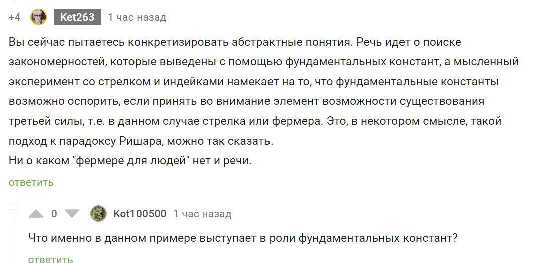 Проблема не в Цисине. И не в его книгах. Проблема имеется, серьезная, и совсем иного рода. Можно сказать, что эта проблема стала системной, к сожалению. Вещи, которые на самом деле являются базовыми и элементарными, в какой-то момент стали "страной чудес". В обсуждении меня спросили о фундаментальных константах. Потому что, как выясняется, большинство просто не знает о том, что такое фундаментальные константы вселенной. Вообще не знает. Совсем. И поэтому не может понять, о чем идет речь и в книгах, и в сериале. Стрелок и фермер, если читали, то понимаете, о чем речь. Просто оставлю это здесь, скрин моего коммента, и один из ответов.
