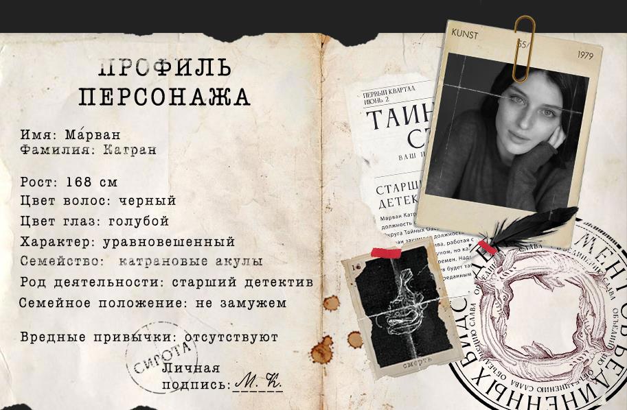 Автор: Мария КарапетянМарван не охотно любит вспоминать о своем прошлом, рассказывать о себе и вообще акцентировать на своей персоне внимание. Но я очень хорошо умею убеждать, поэтому упросила старшего детектива показать вам ее профиль.
