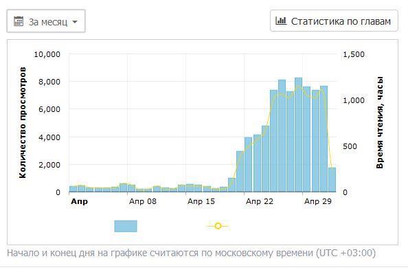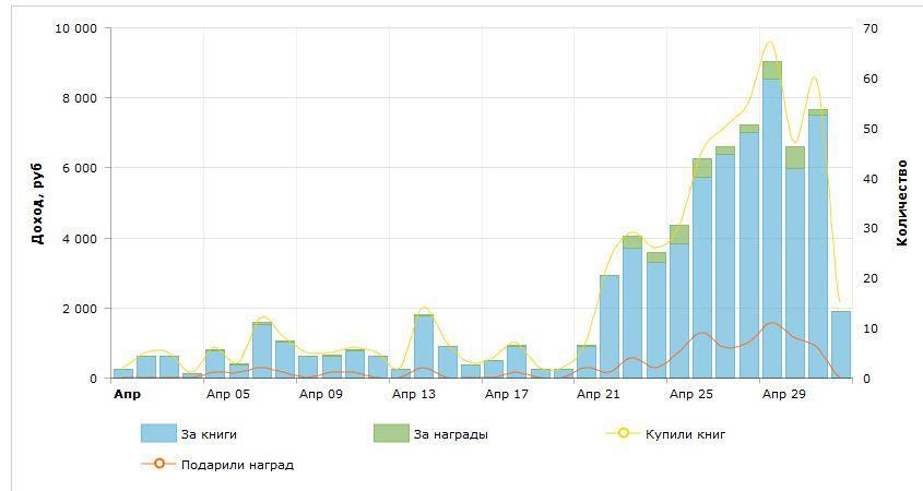 С 1 апреля до 20го апреля, я продал 113 копий, что, вместе с наградами, принесло мне чуть меньше 15000 рублей. Перспективы были - в районе 20000 за месяц. В среднем продавалось 1-5 копий в день, с ростом до 10-20 в день выкладки продолжения. На самом деле - тоже неплохо, с учетом того, что суммарно я уже пересек планку в 100к. Для меня - эпический успех. Однако падение продаж было очевидно и дальше оно должно было лишь нарастать. Причина тоже абсолютно очевидна - я в большей степени исчерпал число тех, кто меня читал и был готов заплатить за продолжение. Печально, но понятно.
