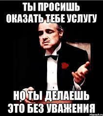 «Ты приходишь и просишь что-то у меня, но ты просишь без уважения» — фраза-мем из фильма «Крестный отец», экранизации известного романа Марио Пьюзо. Ее произнес главный герой Вито Корлеоне по прозвищу «Крестный отец», который возглавлял сильнейшую итало-американскую группу мафиози (роль исполнил американский актер Марлон Брандо). В той сцене к Корлеоне приходит его знакомый Америго Бонасера, который просит помочь разобраться с двумя молодыми людьми, которые избили и пытались изнасиловать его дочь, но в итоге остались безнаказанными даже после американского суда. Вито Корлеоне понимает, почему Бонасера хочет справедливости, но не желает ему помогать, потому что тот не вспоминал об их дружбе все эти годы, ни разу не заглянув даже на чашечку кофе.