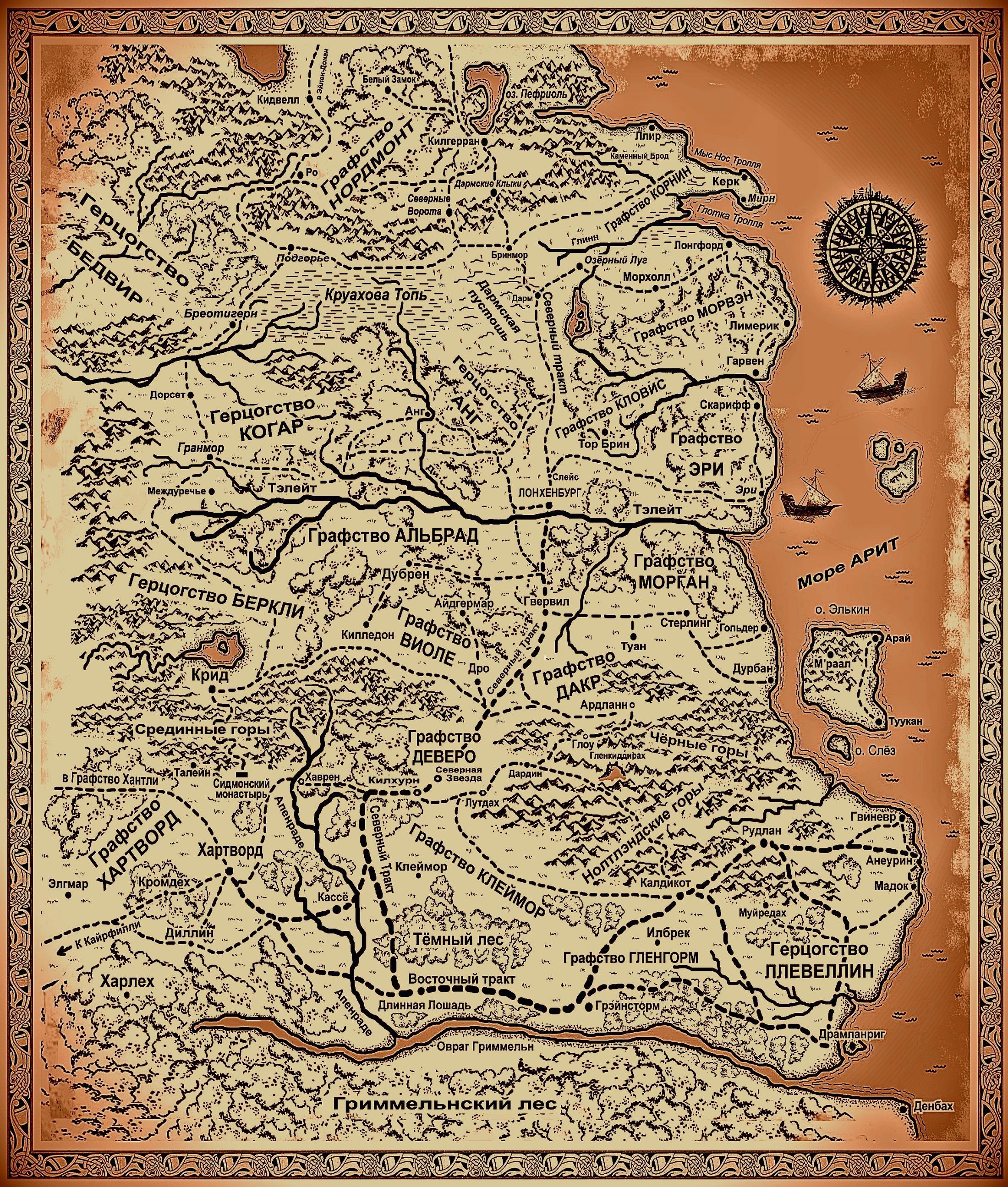 Карта рисовалась долго, ручками, в фотошопе, совершенно примитивно, по мере развития сюжетов, поэтому некоторые места корявые. Конечно, она нуждается в дополнениях и улучшениях, но в целом (уже лет 10) остаётся без изменений.
